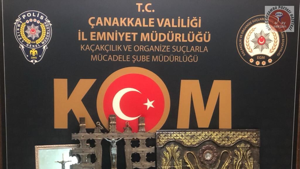 Bir adet 1800’lü yıllara ait olduğu değerlendirilen üzerinde çarmıha gerilmiş Hz. İsa figürü bulunan eski ahşap pano, bir adet 1800’lü yıllara ait olduğu değerlendirilen orta kısmında resimler bulunan çift kanatlı alt kısmında asma kilit bulunan eski ahşap pano, bir adet 1800’lü yıllara ait olduğu değerlendirilen orta kısmında yuvarlak figür bulunan üstünde yaldızlı şekiller bulunan eski ahşap pano,bir adet haç şeklinde eski ahşap parça, bir adet orta kısmında çarmıha gerilmiş Hz. İsa figürü bulunan çerçeveli eski ayna, bir adet duvarda asılı vaziyette çerçeve içinde alfabesi ile yazılmış üzerinde pul bulunan yazı örneği, bir adet kırmızı renkli bez torba içinde arap alfabesi ile yazılmış kırmızı cilt kapağı üzerinde ay yıldız bulunan kitap, bir adet Çanakkale Savaşı’ndan kaldığı değerlendirilen eski gaz ocağı, 5 adet her biri yaklaşık 20 cm uzunluğunda eski ahşap parça-blok ele geçirilerek ilgili karara istinaden el konuldu.