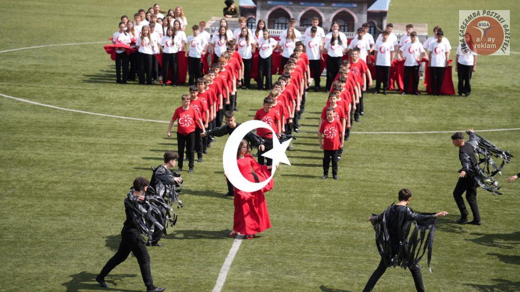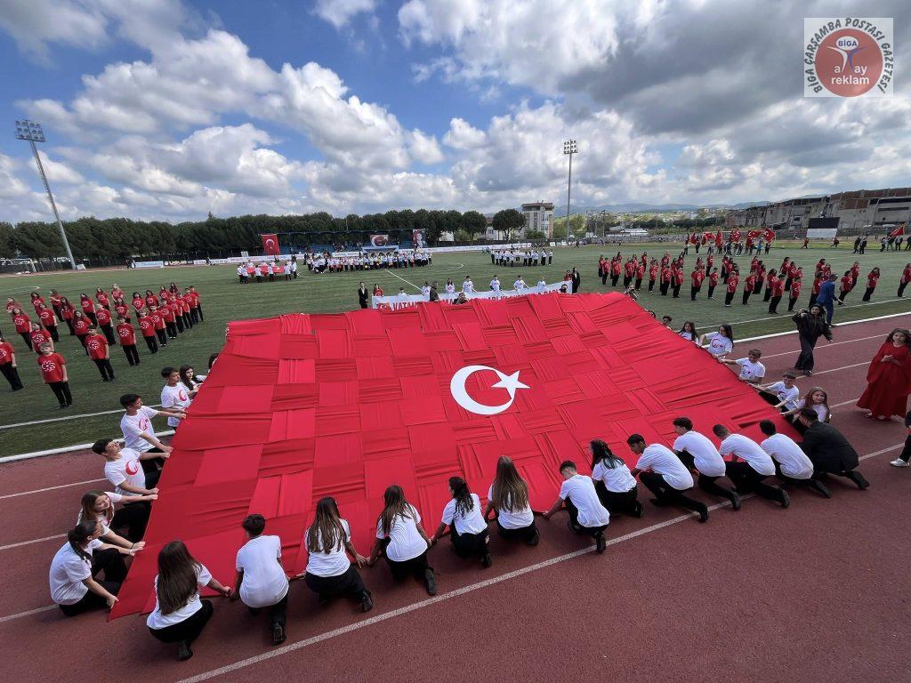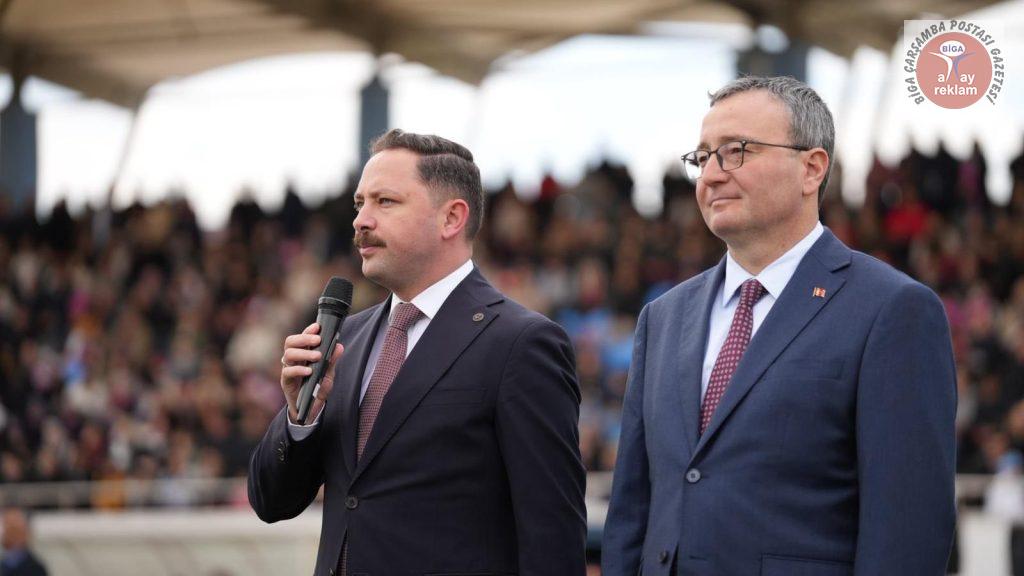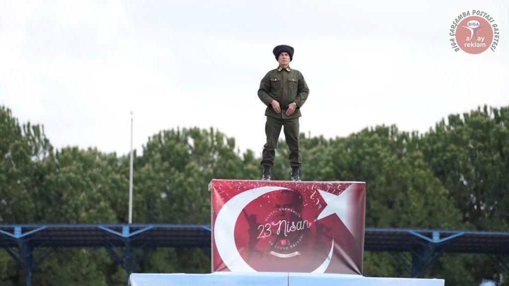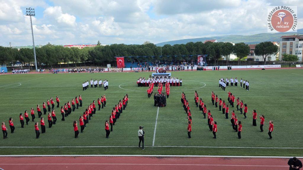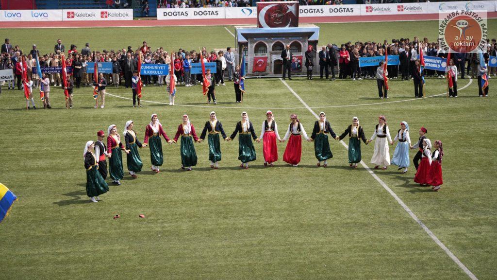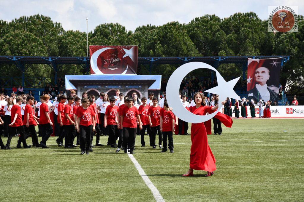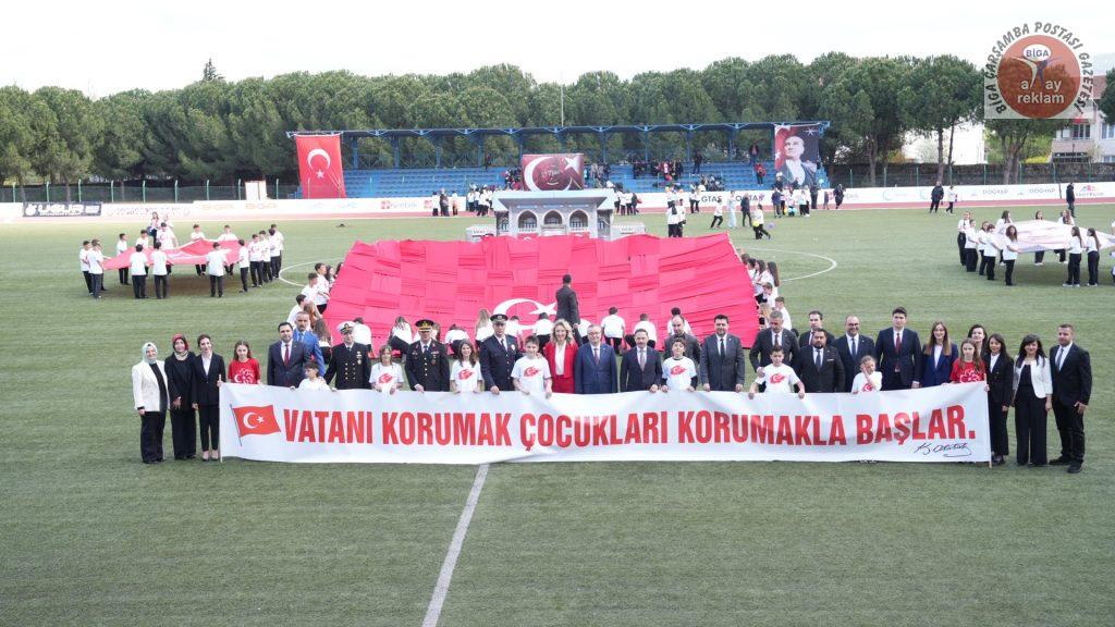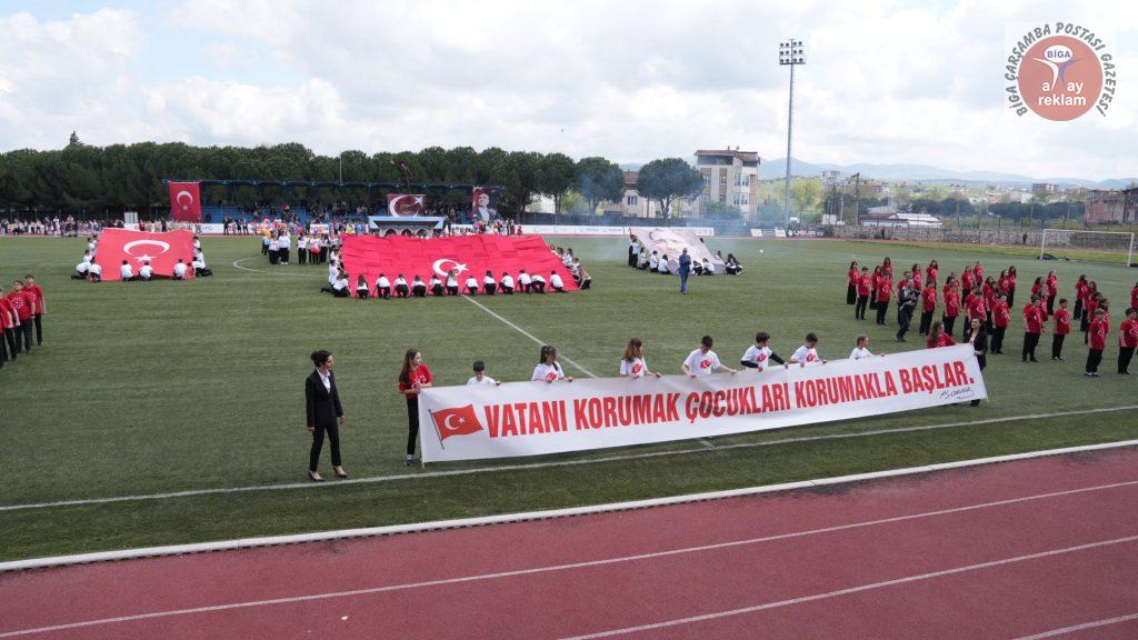 Kutlama programı saat 14.00’de Biga İlyas Bayram Stadyumu’nda devam etti. Biga Kaymakamı Ercan Kayabaşı ve Biga Belediye Başkanı Alper Şen öğrencileri ve stadyumda bulunan halkı selamlayarak 23 Nisan Ulusal Egemenlik ve Çocuk Bayramı’nı kutladılar. Ardından saygı duruşu ve İstiklal Marşı okundu.