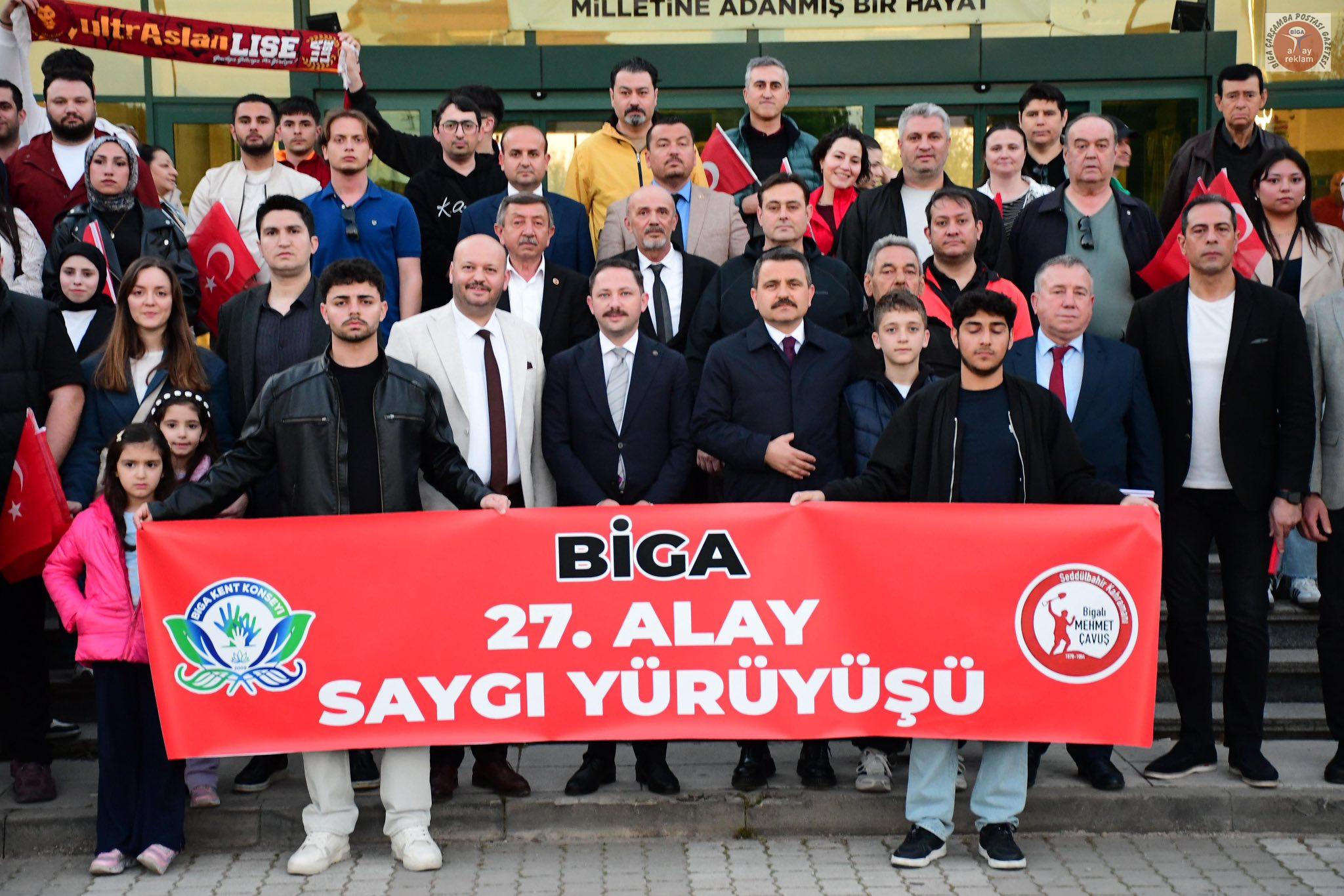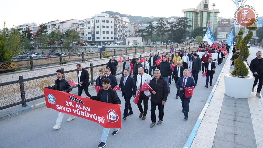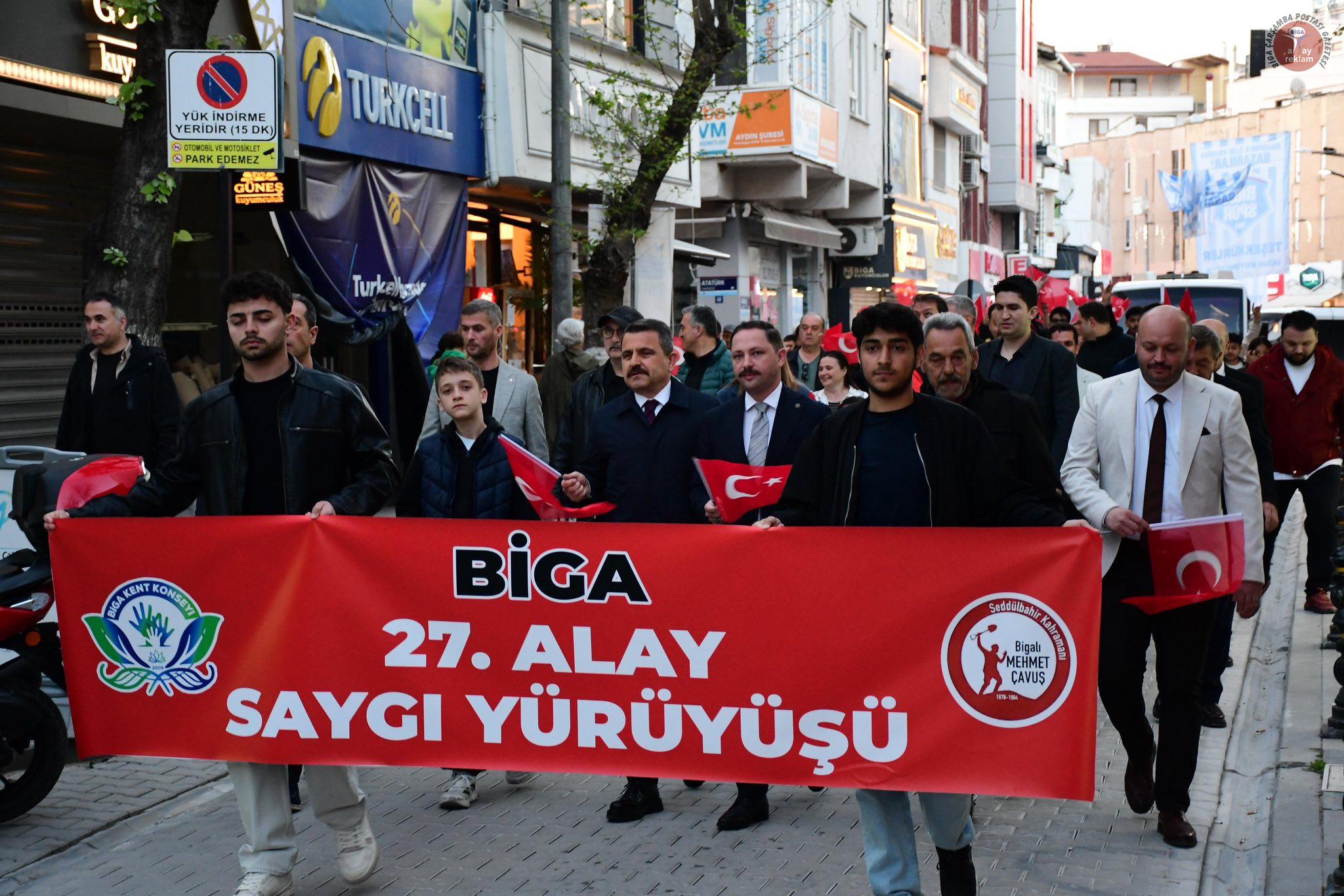 Biga Kent Konseyi ile Bigalı Mehmet Çavuş Derneği’nin düzenlediği saat 19.30’da Hükümet Meydanı’nda başlayan 27. Alay Saygı Yürüyüşü’ne, Biga Kaymakamı Ercan Kayabaşı, Çanakkale Savaşları Gelibolu Tarihi Alan Başkanı İsmail Kaşdemir, Biga Belediye Başkan Yardımcısı Ergün Tulnay, Biga Cumhuriyet Başsavcısı Hüseyin Demir ve vatandaşlar katıldı.
