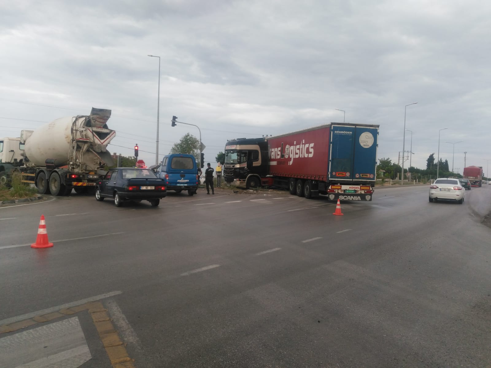 Biga Çanakkale yolu Balıklıçeşme mevkiinde yağış nedeniyle direksiyon hakimiyetini kaybeden TIR şoförü yolda bulunan maket polis aracına çarptı.