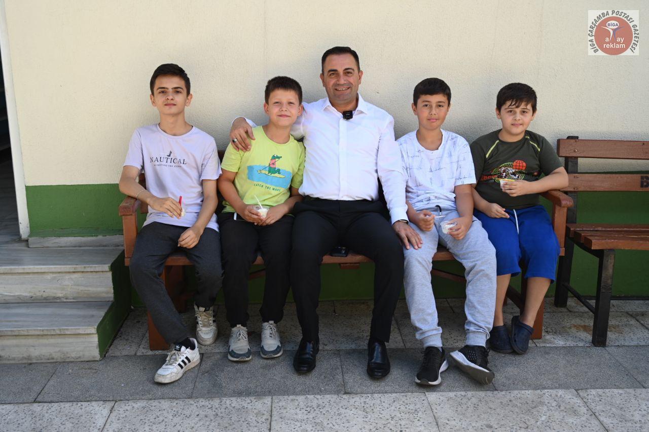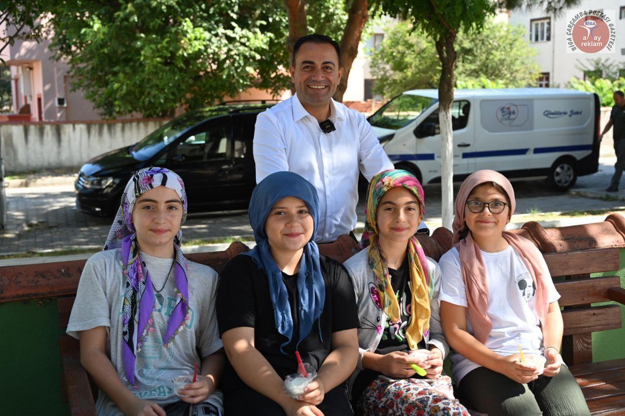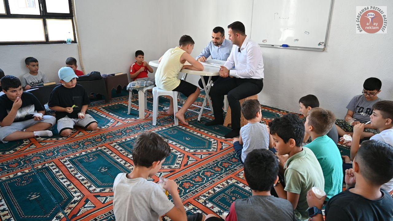 Biga Belediye Başkanı Bülent Erdoğan, Yaz Kur’an kurslarında eğitim gören çocukları ziyaret etti. Başkan Erdoğan, öğrencilere ikramlarda bulunarak onların yaz tatillerine anlamlı bir renk kattı.
