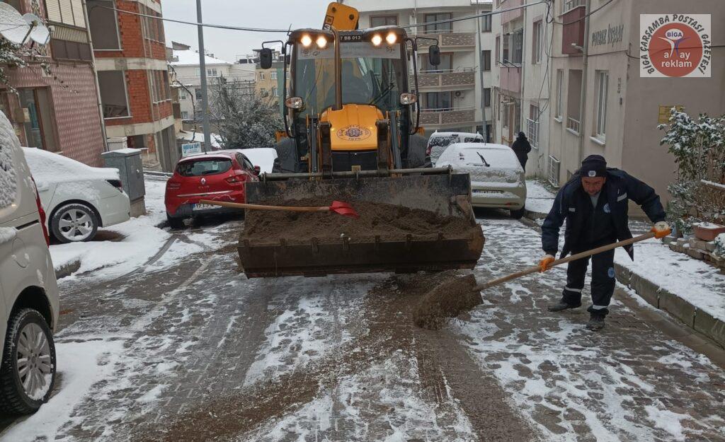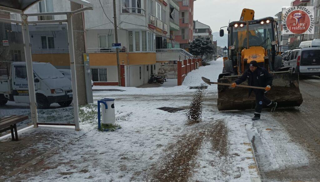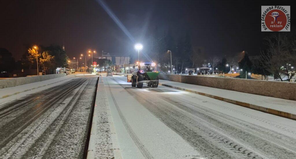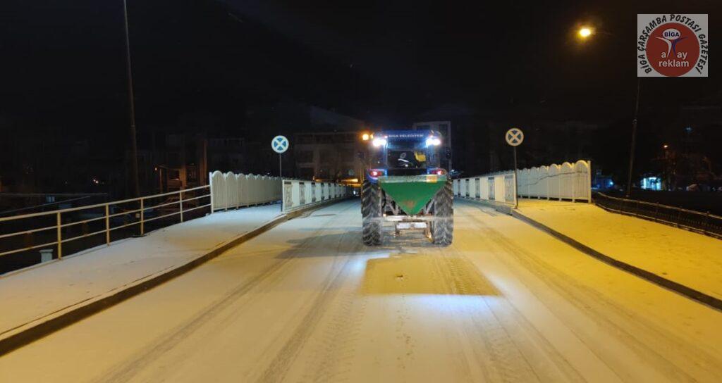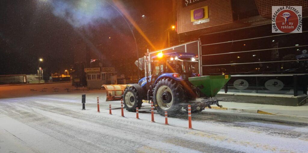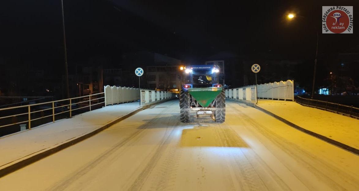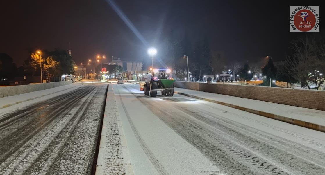 Tüm yurtta etkili olan kar yağışı ve soğuk hava, Biga’da da gece saatlerinden itibaren etkisini artırdı. Meteoroloji Genel Müdürlüğü, Marmara Bölgesi için sarı ve turuncu kodlu uyarı verirken, kar kalınlığının 5 cm olduğu Biga ilçe merkezinde Biga Belediyesi ekipleri gece saatlerinden itibaren yolları temizledi. Ekipler, don ve buzlanma olaylarına karşı ana ve ara yollar ile kaldırımları sık sık tuzlama çalışması yaptı.