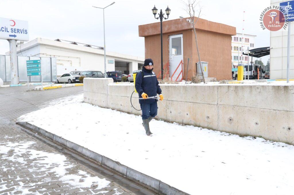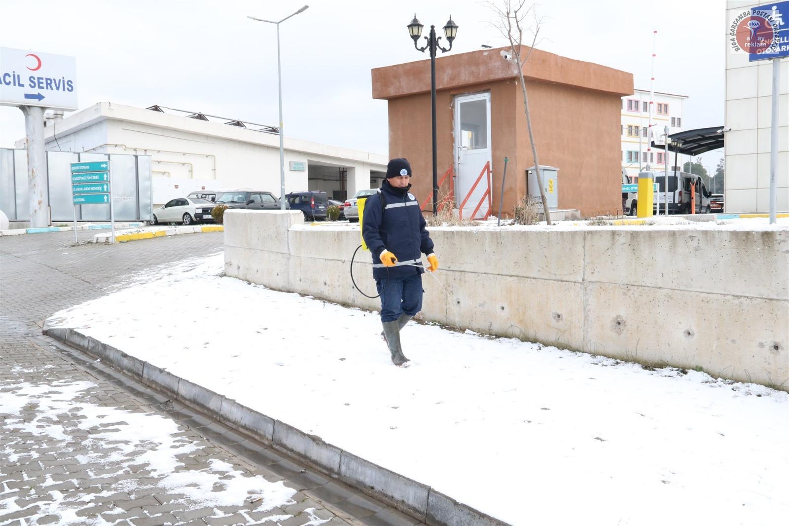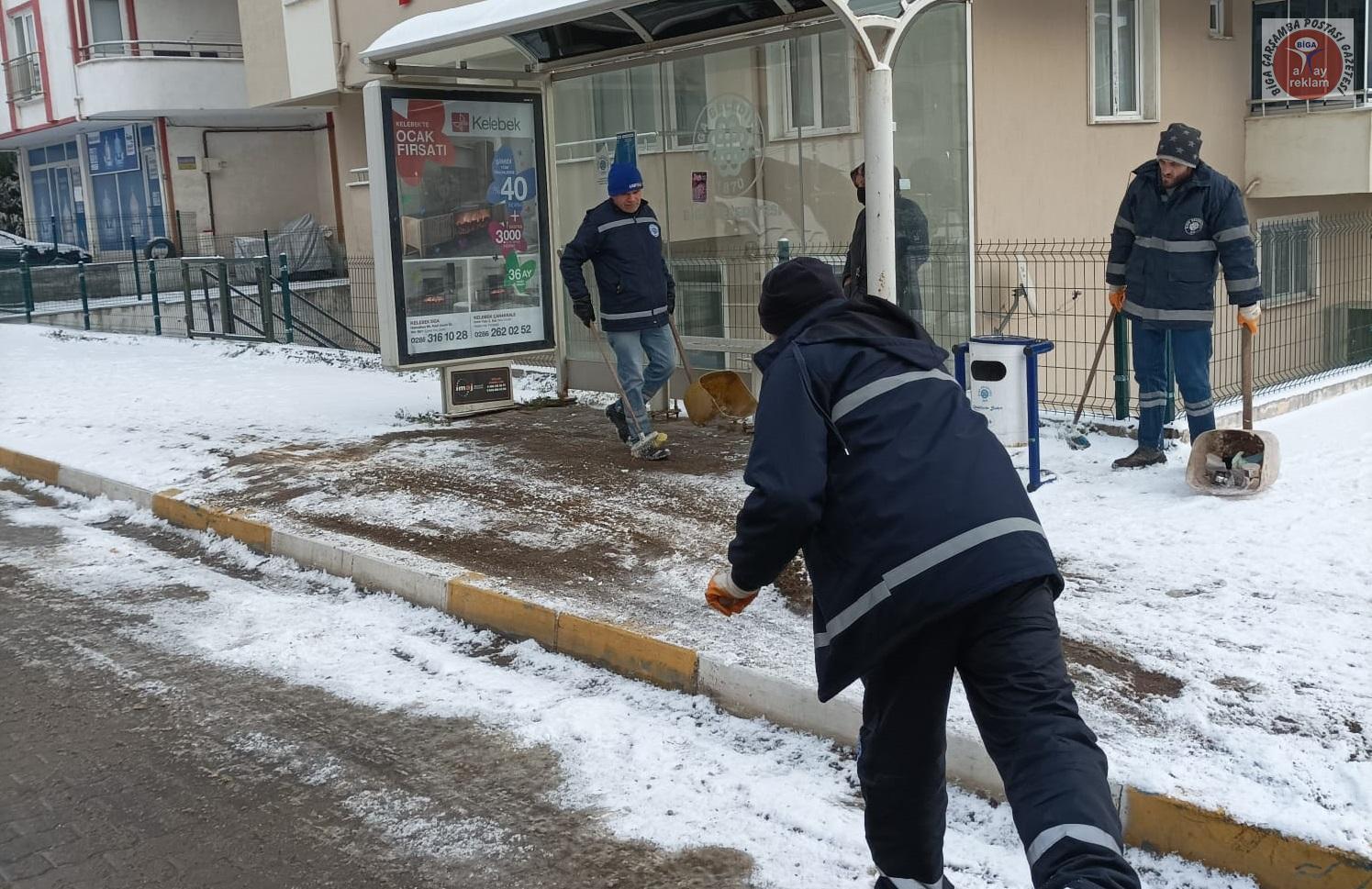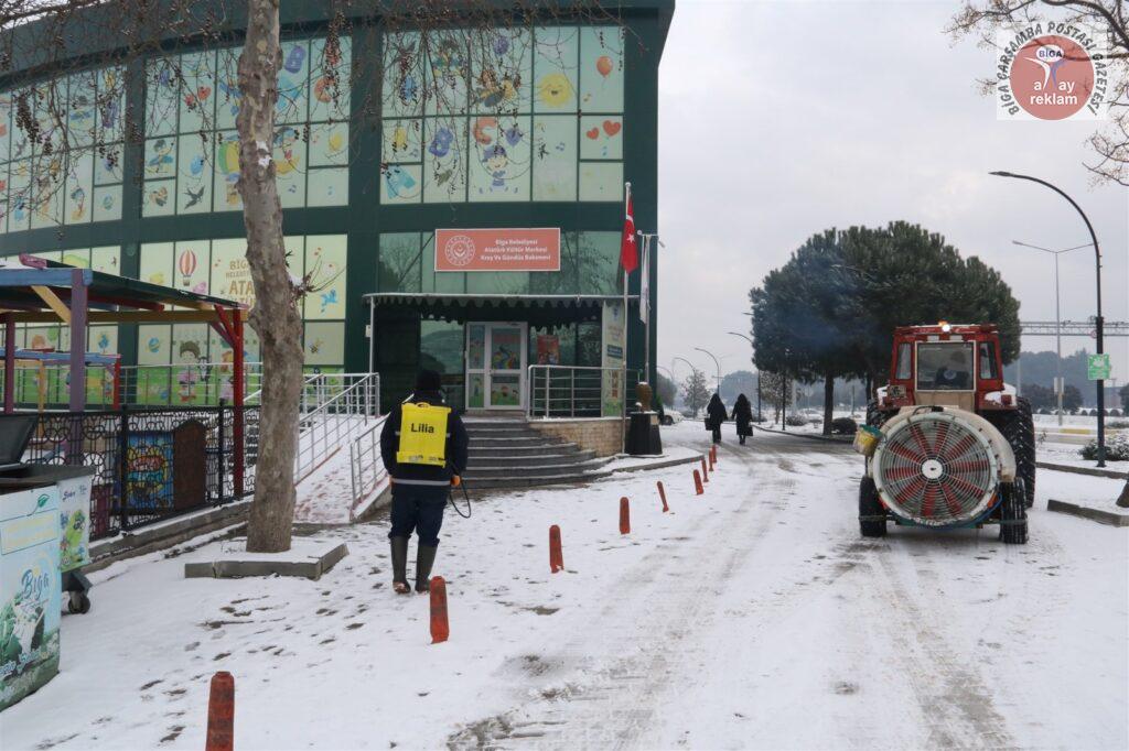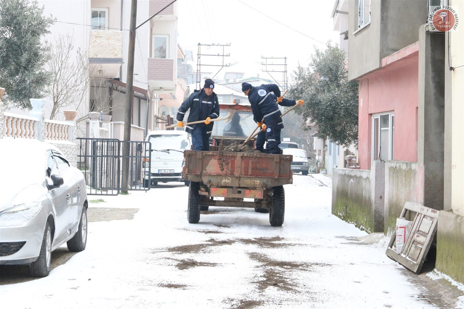 Tüm yurtta etkili olan kar yağışı ve soğuk hava, Biga’da da gece saatlerinden itibaren etkisini artırdı. Meteoroloji Genel Müdürlüğü, Marmara Bölgesi için sarı ve turuncu kodlu uyarı verirken, kar kalınlığının 5 cm olduğu Biga ilçe merkezinde Biga Belediyesi ekipleri gece saatlerinden itibaren yolları temizledi. Ekipler, don ve buzlanma olaylarına karşı ana ve ara yollar ile kaldırımları sık sık tuzlama çalışması yaptı.