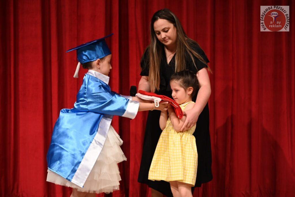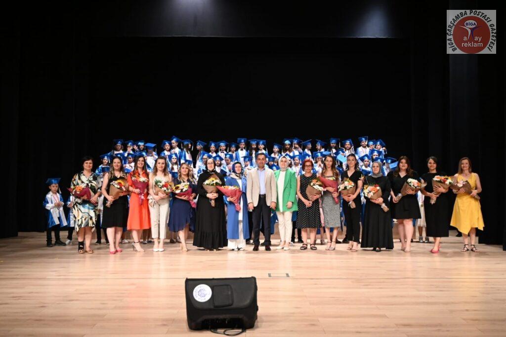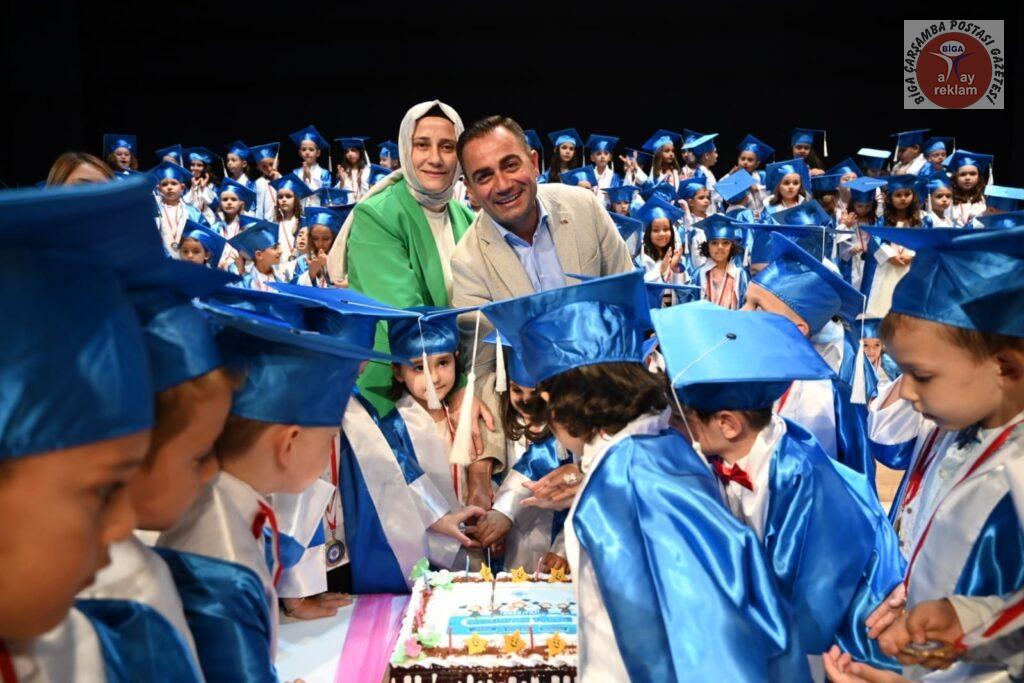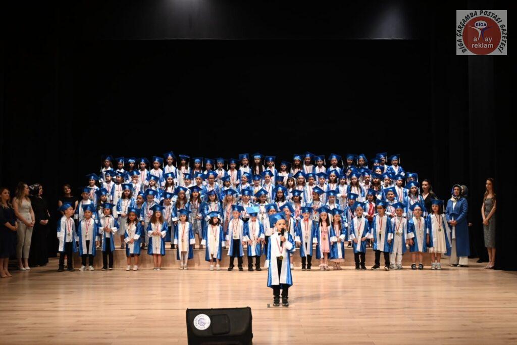 Program Saygı Duruşu ve İstiklal Marşı’nın okunması ile başladı. Biga Belediye Başkanı Bülent Erdoğan’ın konuşmasının ardından mezun olan bir öğrenci bir alt gruptaki öğrenciye Türk Bayrağını emanet etti. 102 öğrenci kep atarak mezun olmanın mutluluğunu yaşarken, Başkan Erdoğan miniklerle beraber mezuniyet pastası keserek tüm öğrencileri ve ailelerini tebrik etti.
