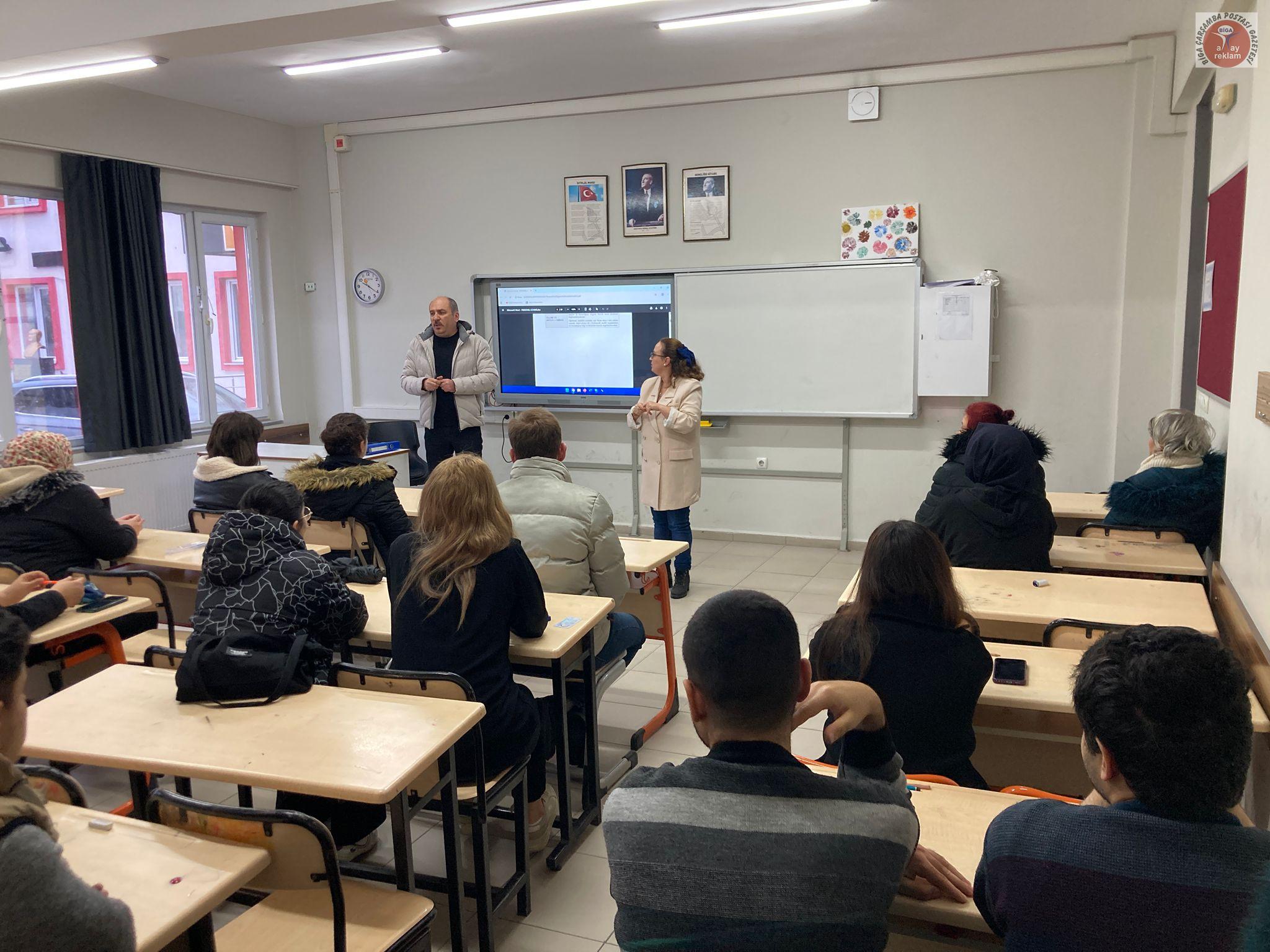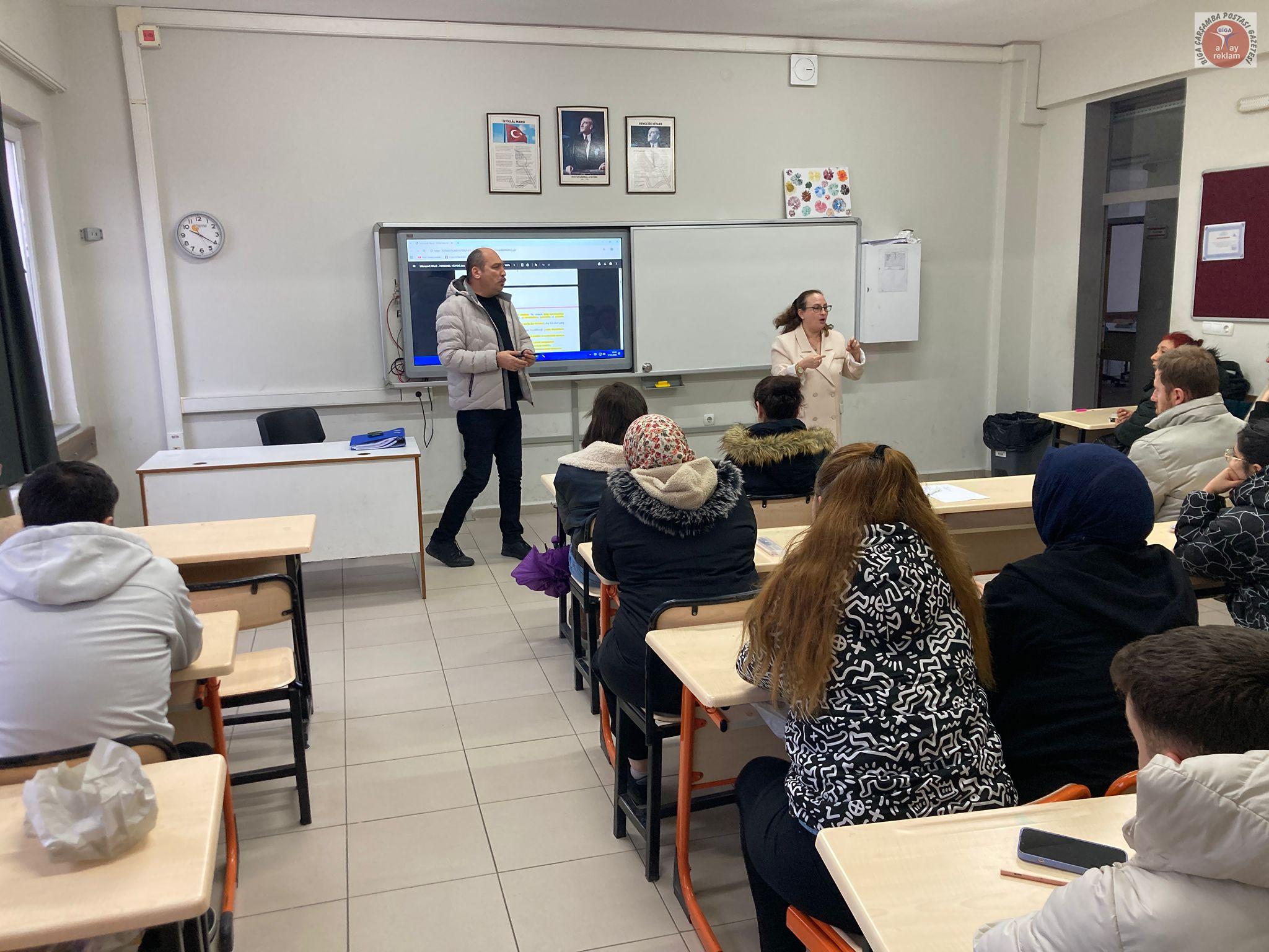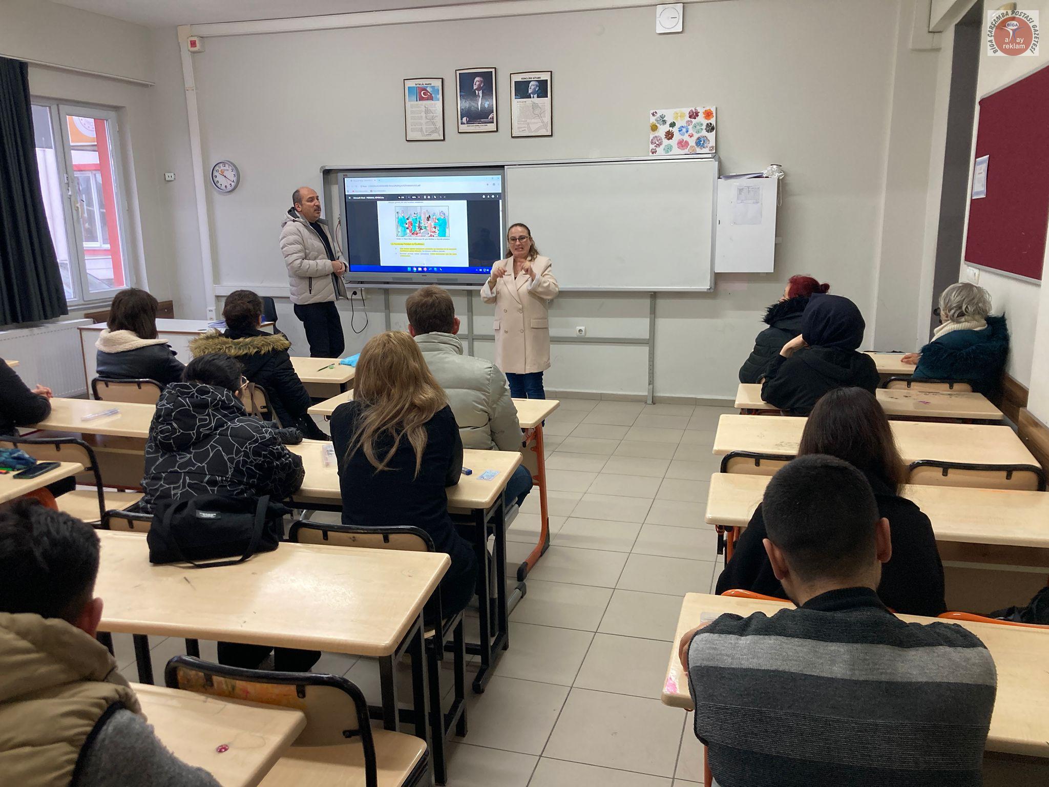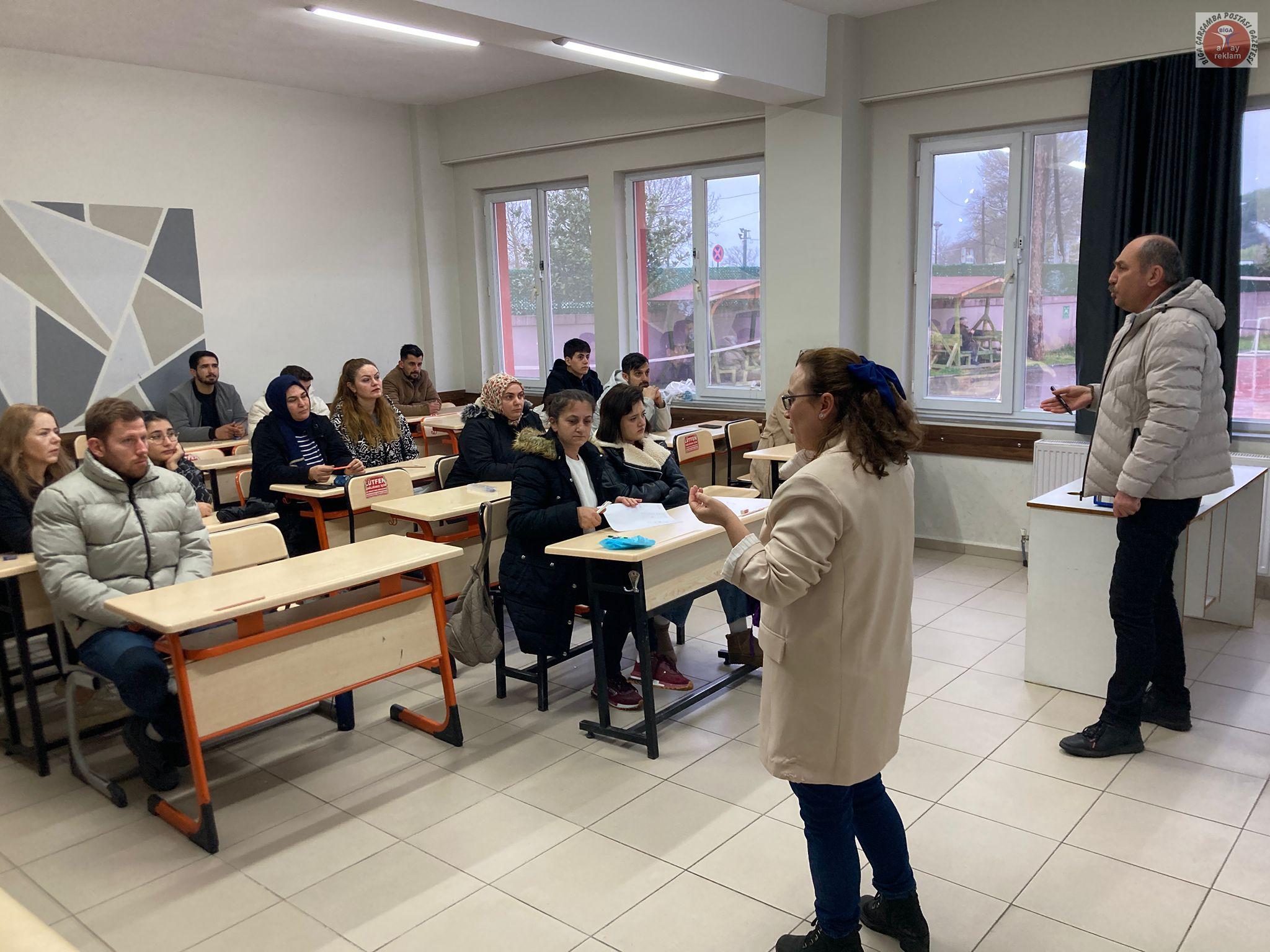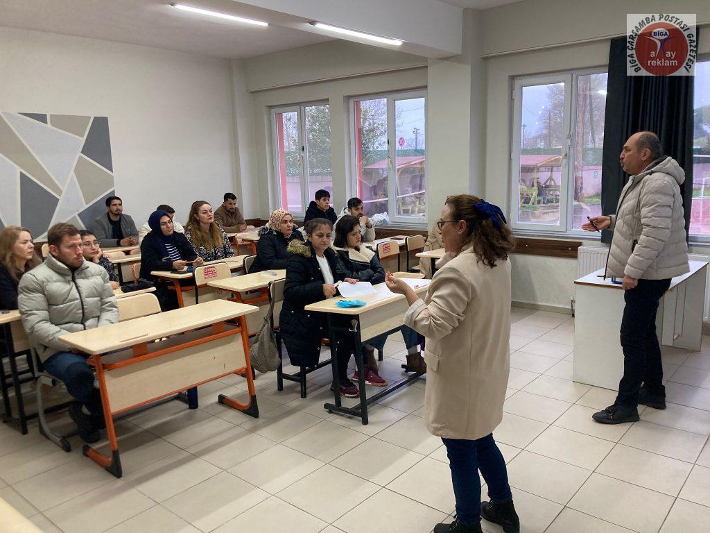 Biga Halk Eğitimi Merkezi bünyesinde düzenlenen “Gıda Üretim ve Perakende İş Yerleri ile Su Sektöründe Çalışanlar İçin Kişisel Hijyen Eğitimi” kursunda, işitme engelli bir kursiyerin eğitimden mahrum kalmaması için özel bir çalışma yapıldı. Kurs öğretmeni Emin Başar tarafından verilen teknik ders, Türk İşaret Dili eğitmeni Arzu Ertuğrul Ayva’nın çevirisiyle desteklendi.