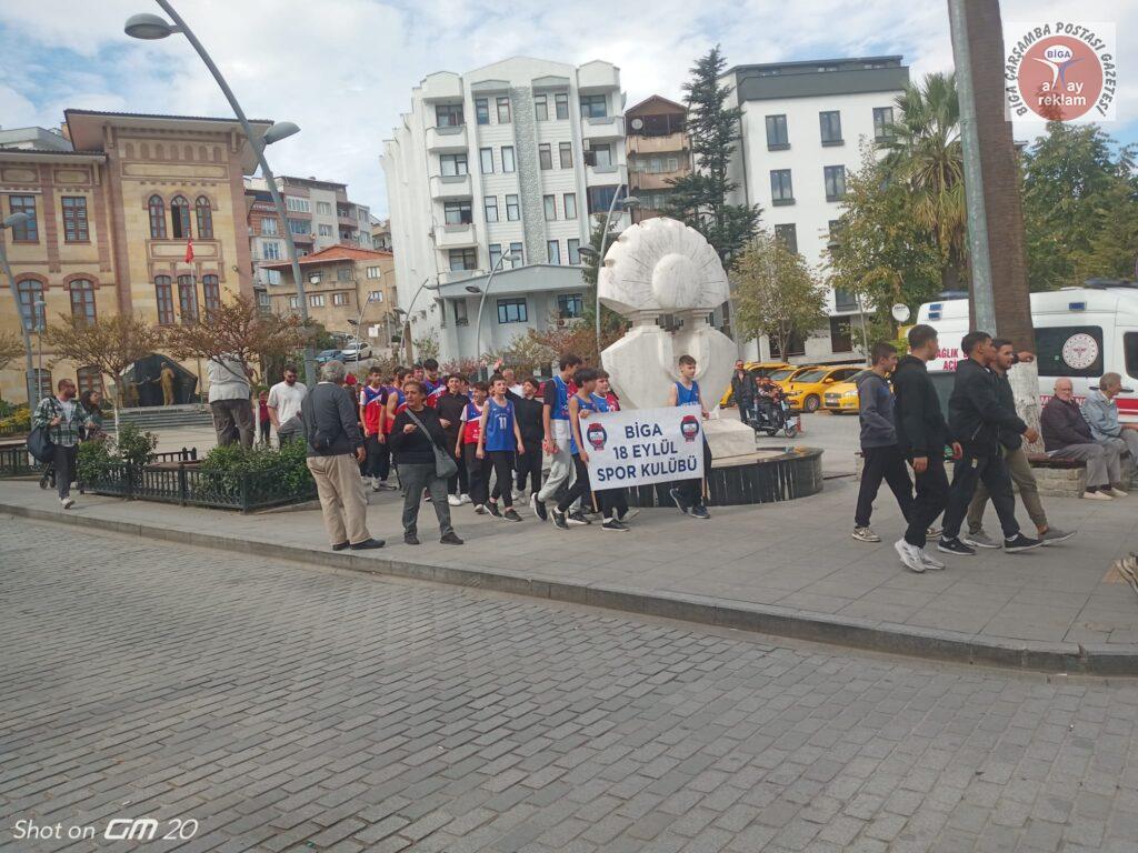 Yürüyüşe, Biga Kaymakamı Ercan Kayabaşı, Biga Belediye Başkan Yardımcısı Ergün Tulnay, Biga İlçe Milli Eğitim Müdürü Muhammet Nazlıcan, Biga İlçe Spor Müdürü Zekeriya Mercan, Biga İlçe Emniyet Müdürü Emre Bolat, Biga İlçe Tarım Müdürü Fevzi Atmaca, ilçe protokolü, kurum müdürleri, sporcular, öğrenciler ve Biga Halkı katıldı.
