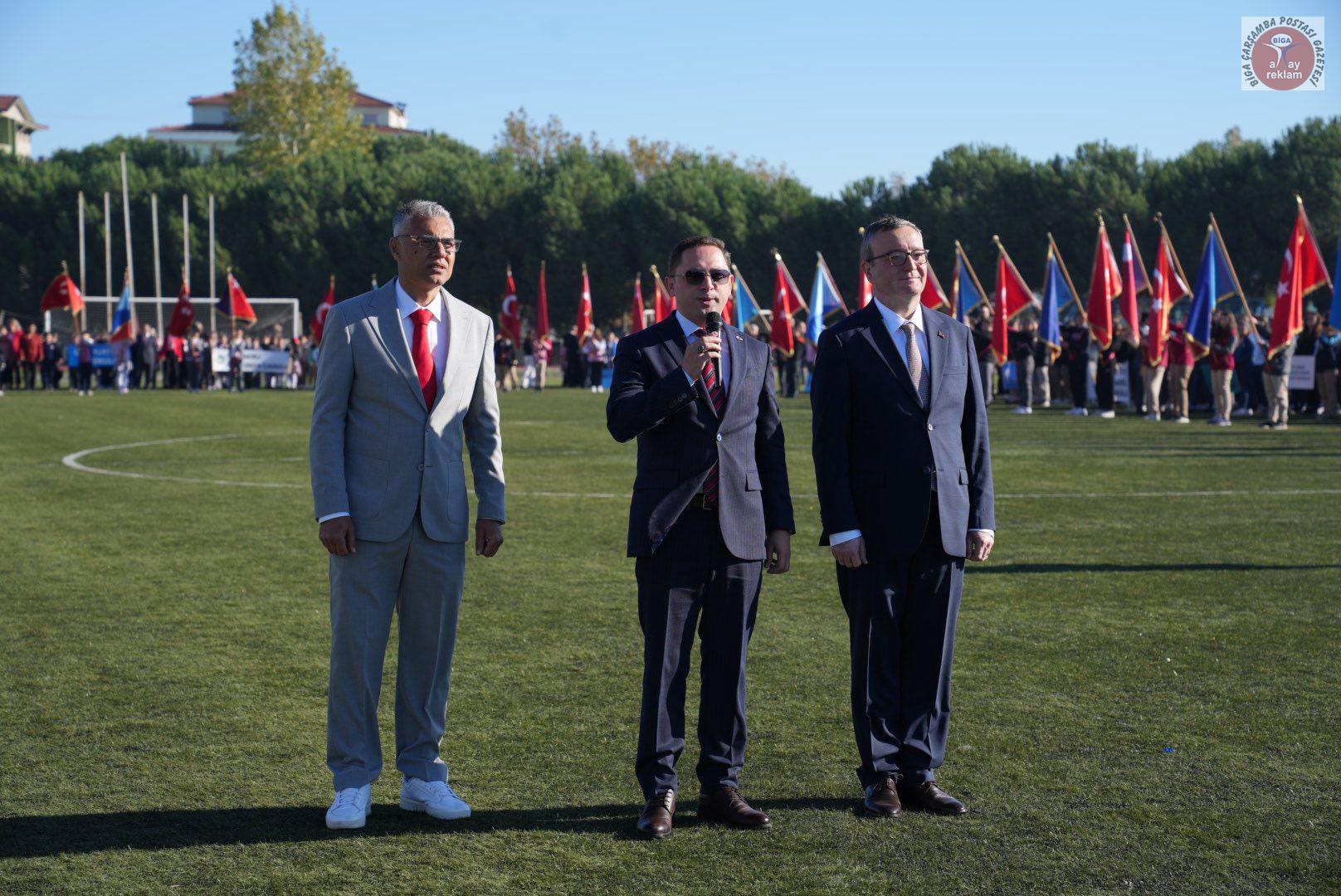 Tören, Biga Kaymakamı Ercan Kayabaşı ve Biga Belediye Başkanı Alper Şen’in öğrencilerin ve halkın bayramını kutlamasının ardından saygı duruşu ve İstiklal Marşı’nın okunması ile başladı. Törene, Biga Kaymakamı Ercan Kayabaşı, Biga Belediye Başkanı Alper Şen, Biga Cumhuriyet Başsavcısı Hüseyin Demir, Biga İlçe Emniyet Müdürü Emre Bolat, Biga İlçe Milli Eğitim Müdürü Muhammet Nazlıcan, siyasi parti temsilcileri ve yöneticileri, STK üyeleri, oda başkanları ve yöneticileri, kurum müdürleri, daire amirleri, okul müdürleri, öğretmenler, öğrenciler, çok sayıda vatandaş ve basın mensupları katıldı.