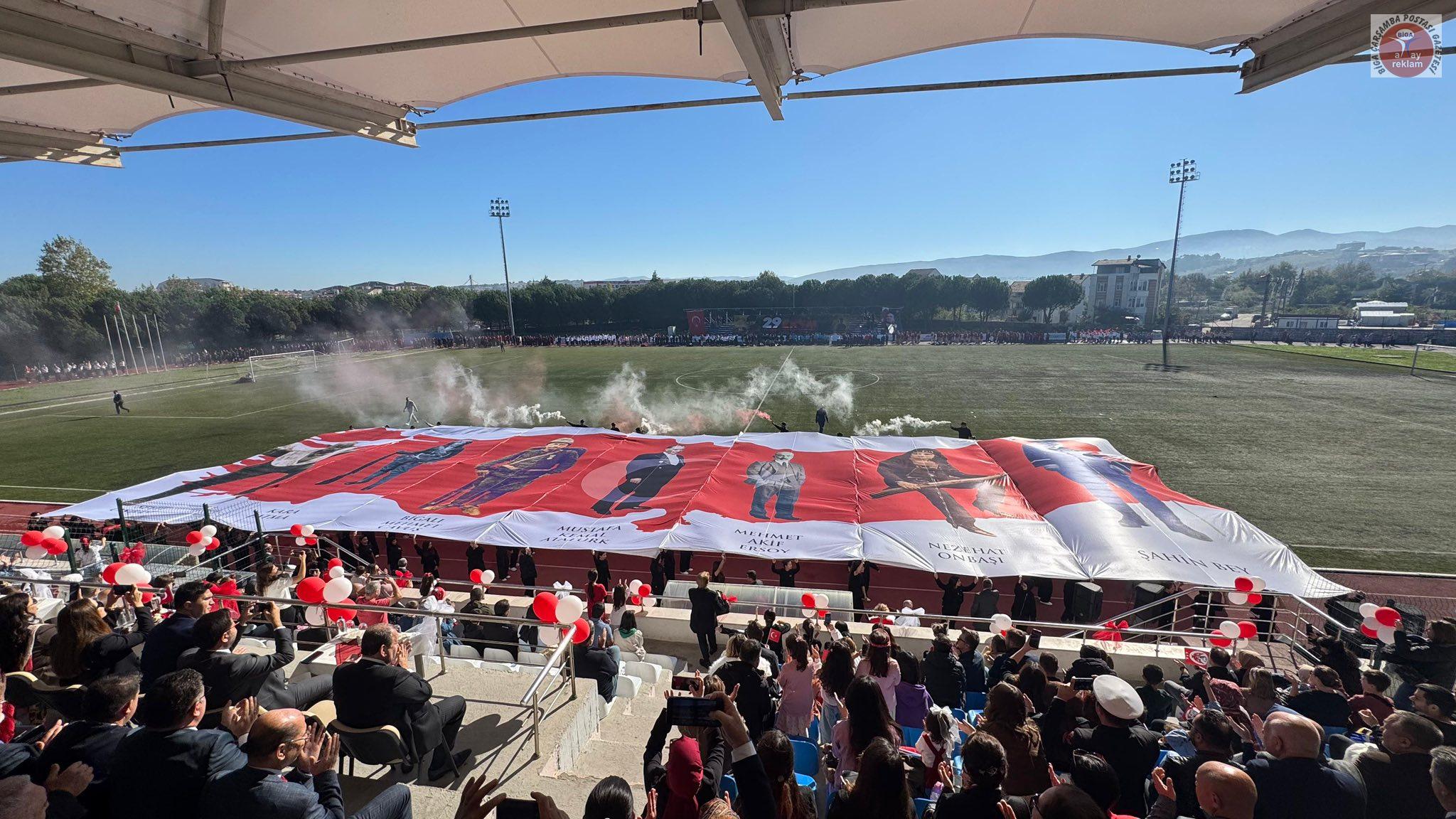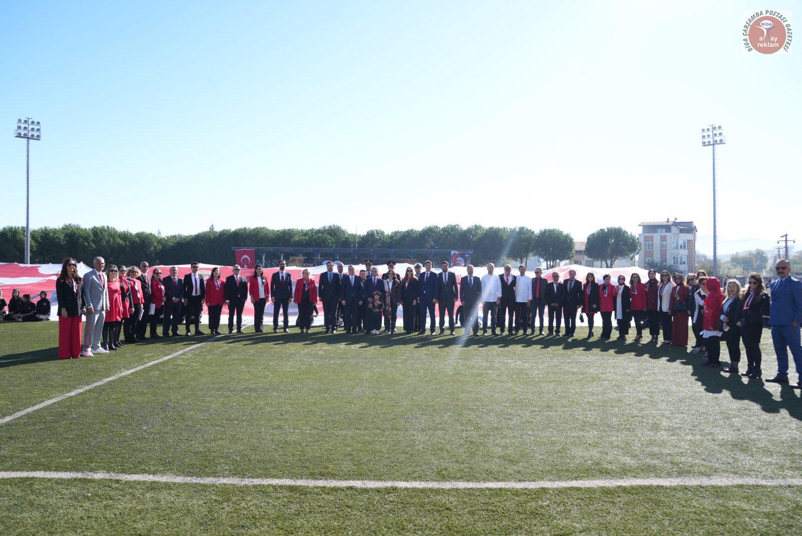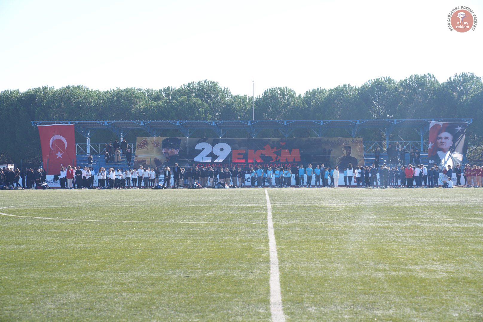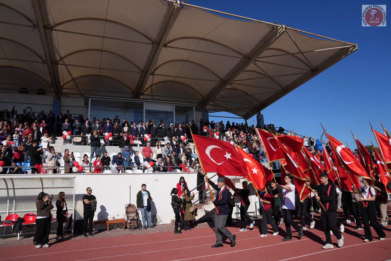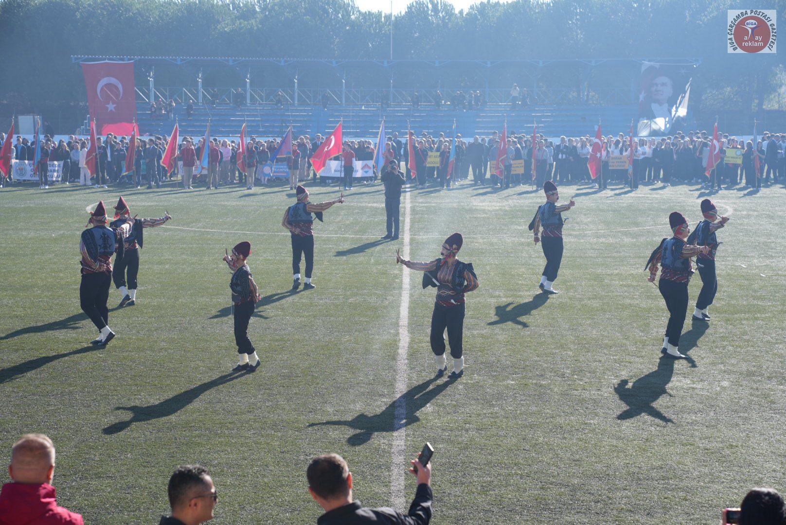 Biga Kaymakamı Ercan Kayabaşı günün anlam ve önemini belirten konuşma gerçekleştirdi. Cumhuriyetin 102. Yıl kutlamalarında Seymenler Halk Oyunları Ekibinin gösterileri büyük alkış aldı. Ayşe Doğan Mesleki ve Teknik Anadolu Lisesi öğrencisi Dilruba Ceylin Karademir ‘Cumhuriyet’ adlı şiirini okudu. Cumhuriyetin 102. Yıl kutlamaları için düzenlenen çeşitli yarışmalarda dereceye giren öğrencilere ödüllerinin verilmesinin ardından Ayşe Doğan Mesleki ve Teknik Anadolu Lisesi öğrencileri ‘Kurtuluştan Kuruluşa’ adlı gösterisini gerçekleştirdi. Büyük alkış alan gösterinin ardından bayrak flama geçişi ile program sona erdi.