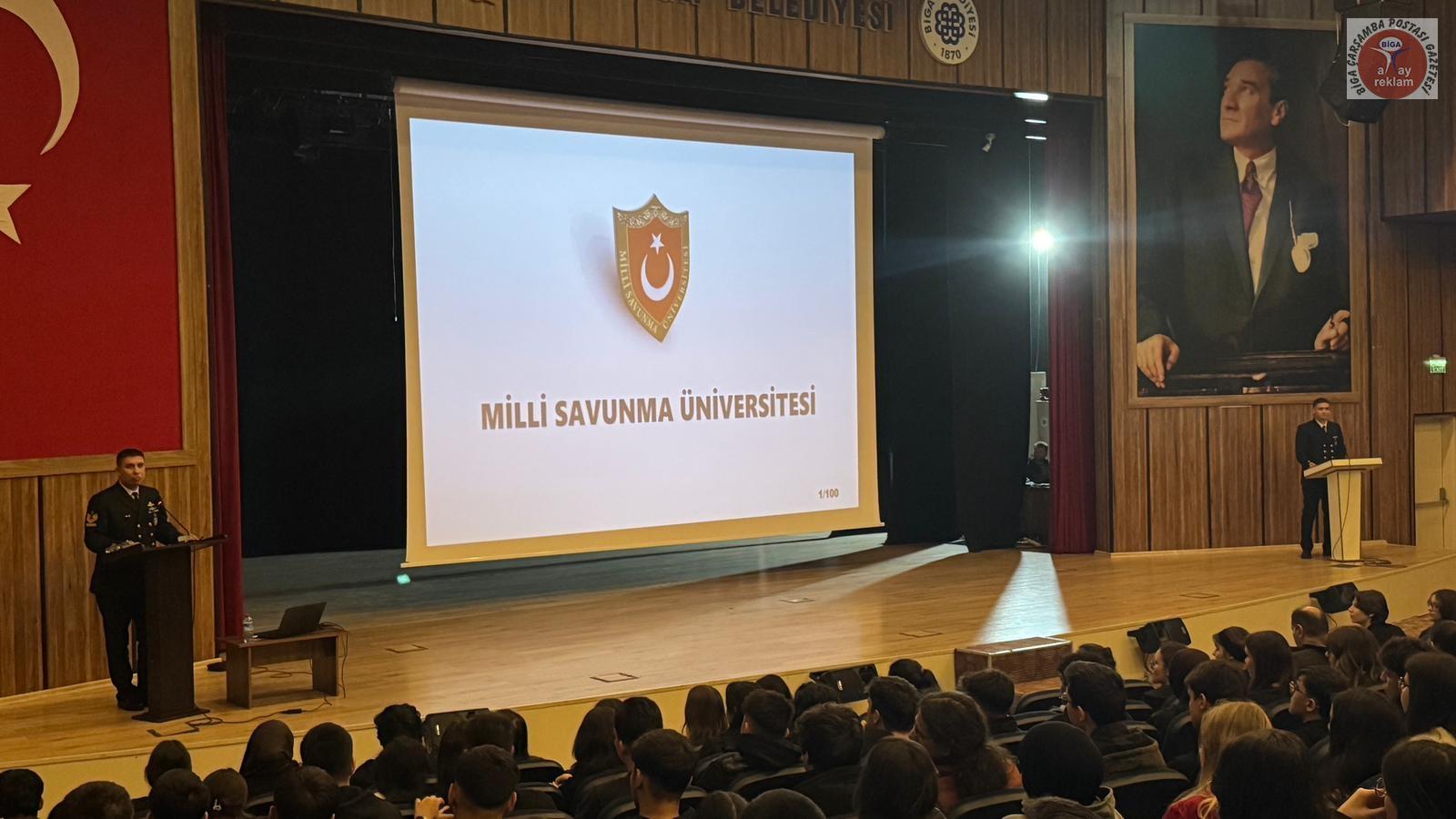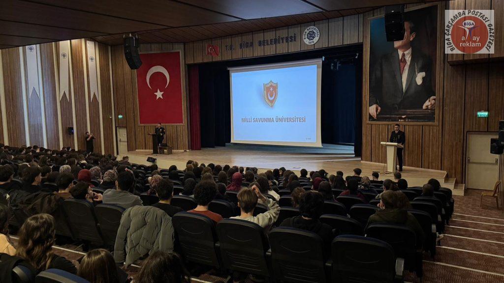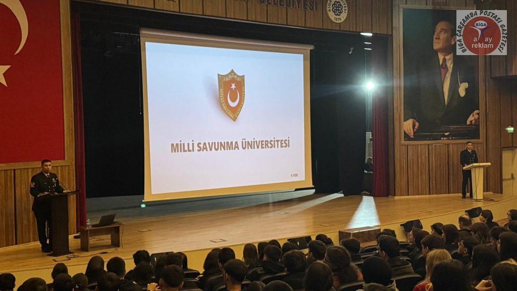 Tanıtım programı kapsamında Üsteğmen Abdil Göğebakan ve Astsubay Mehmet Derici, 12. sınıf öğrencilerine Millî Savunma Üniversitesi başvuru süreci hakkında kapsamlı bilgilendirmelerde bulundu. Gerçekleştirilen sunumda; MSÜ’nün öğrenci alım şartları, üniversitenin sunduğu eğitim ve sosyal imkânlar ile fakülte ve bölümler detaylı şekilde ele alındı.