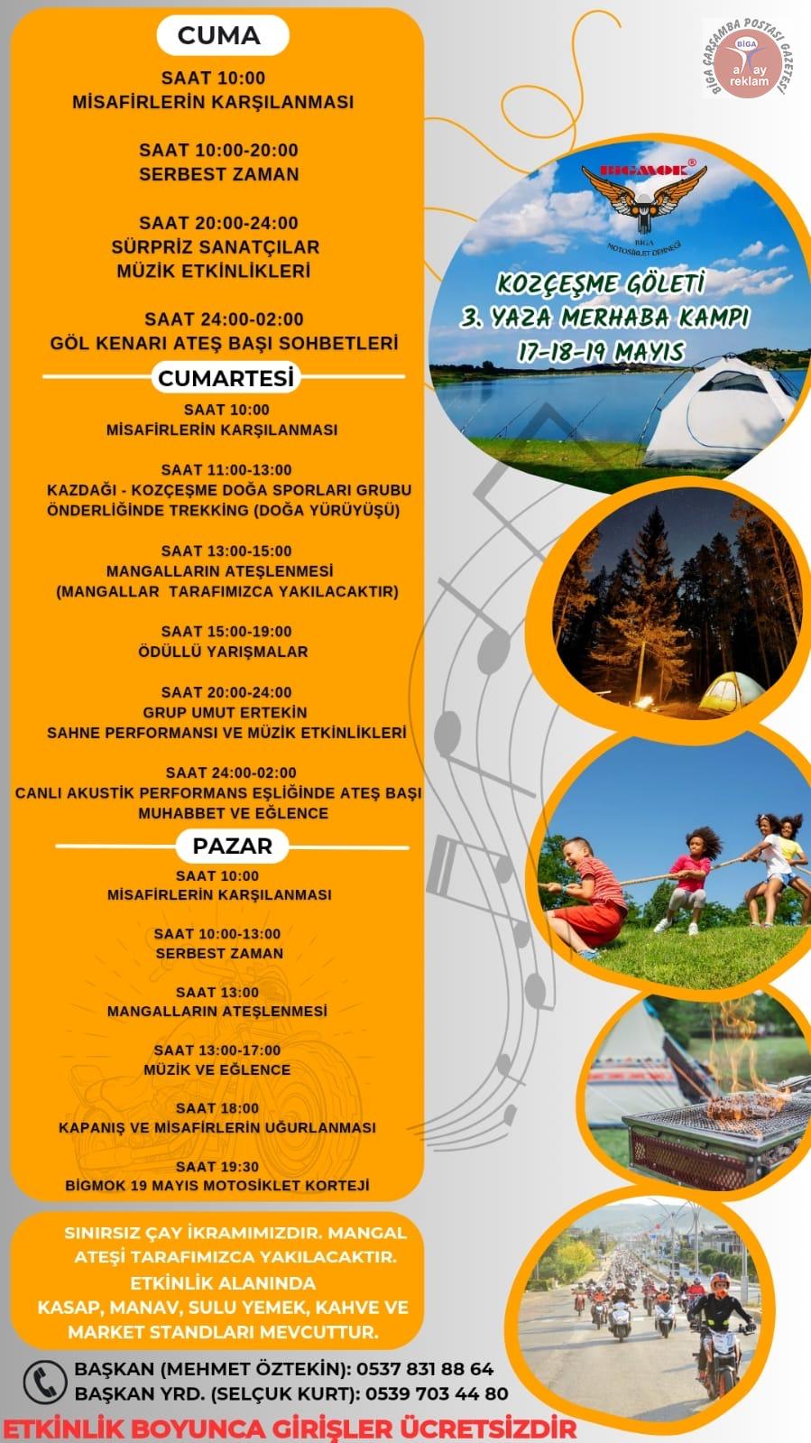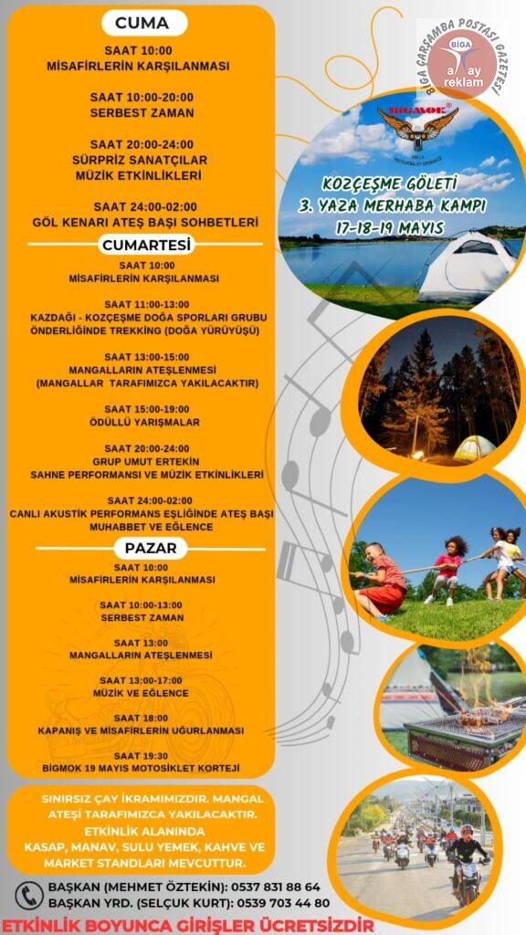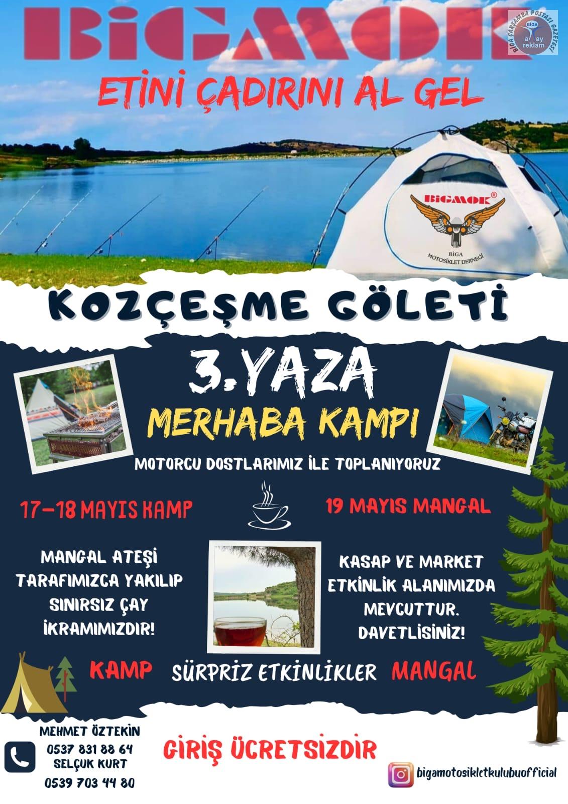 Etkinlik ile ilgili Biga Motosiklet Derneği Başkanı Mehmet Öztekin yaptığı açıklamada şu ifadelere yer verdi; “BİGMOK Yaza Merhaba Kampını Rotanıza Eklemeyi Unutmayın.. Etini, çadırını al gel. Kozçeşme Göleti’nde Yaza Merhaba etkinliğinde motorcu dostlarımızla buluşuyoruz. Mangal ateşi tarafımızca yakılacak olup sınırsız çay ikramımızdır. 19 Mayıs Pazar günü mangal, kasap ve market etkinlik alanımızda mevcuttur.
