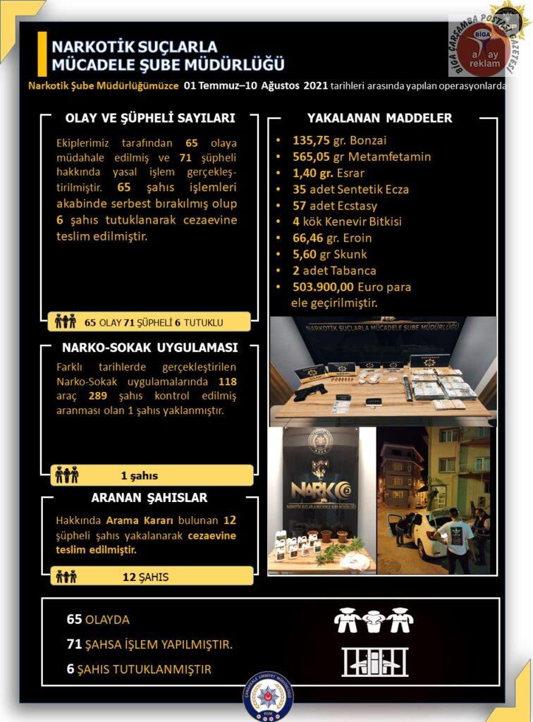 Narkotik Suçlarla Mücadele Şube Müdürlüğünce İl Merkezi ve İlçelerde Uyuşturucu Madde Satışı yapan ve Kullanan Şahıslara yönelik 01.07.2021-10.08.2021 tarihleri arasında gerçekleştirilen operasyonlarda;