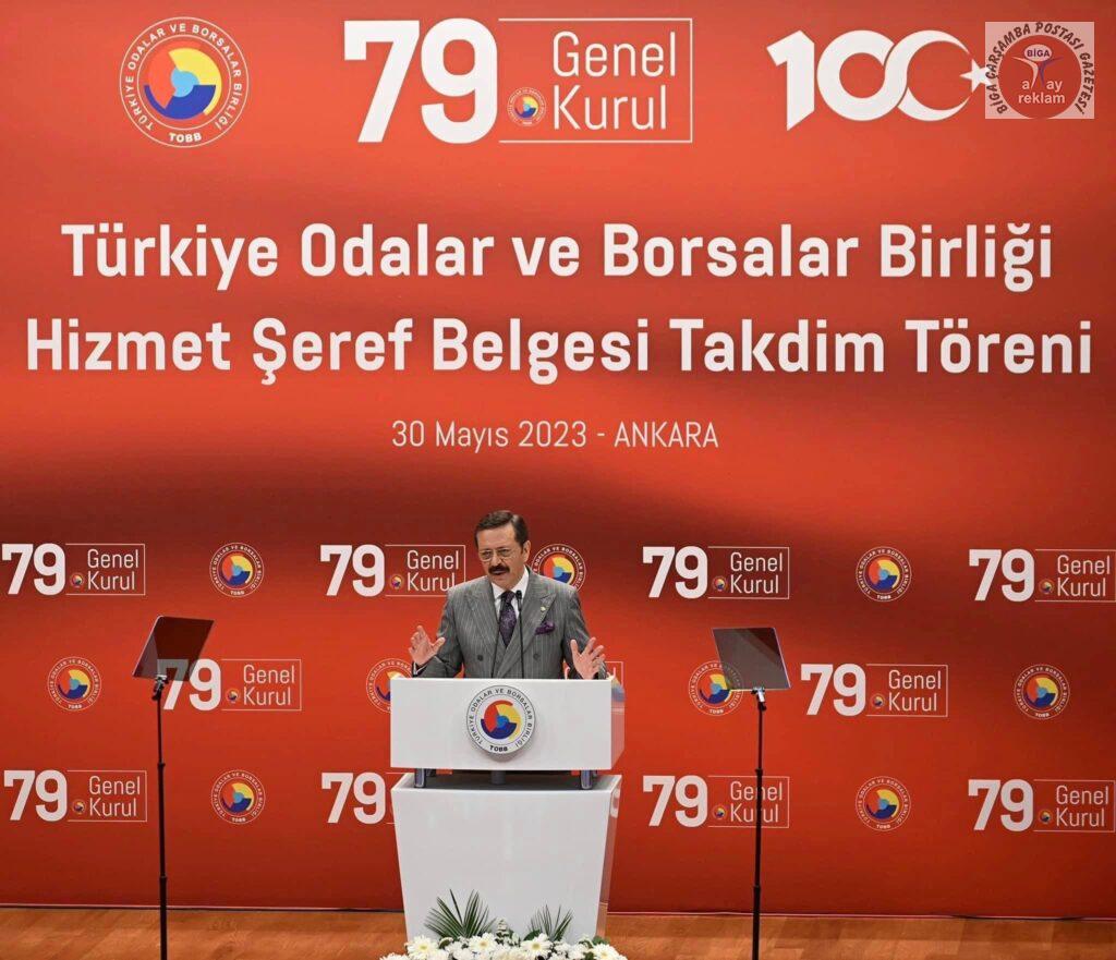 Türkiye Odalar ve Borsalar Birliği’nin 79. Genel Kurulu kapsamında 30 Mayıs 2023 Salı günü saat.15.00’de TOBB Birlik Merkezinde yapıldı. TOBB camiasına ve ülke ekonomisine hizmette bulunan delegelere Hizmet Şeref Belgeleri ve Plaketleri Cumhurbaşkanı Recep Tayyip Erdoğan’ın katılımıyla, TOBB Başkanı M.Rifat Hisarcıklıoğlu’nun ev sahipliğinde düzenlenen törende verildi.