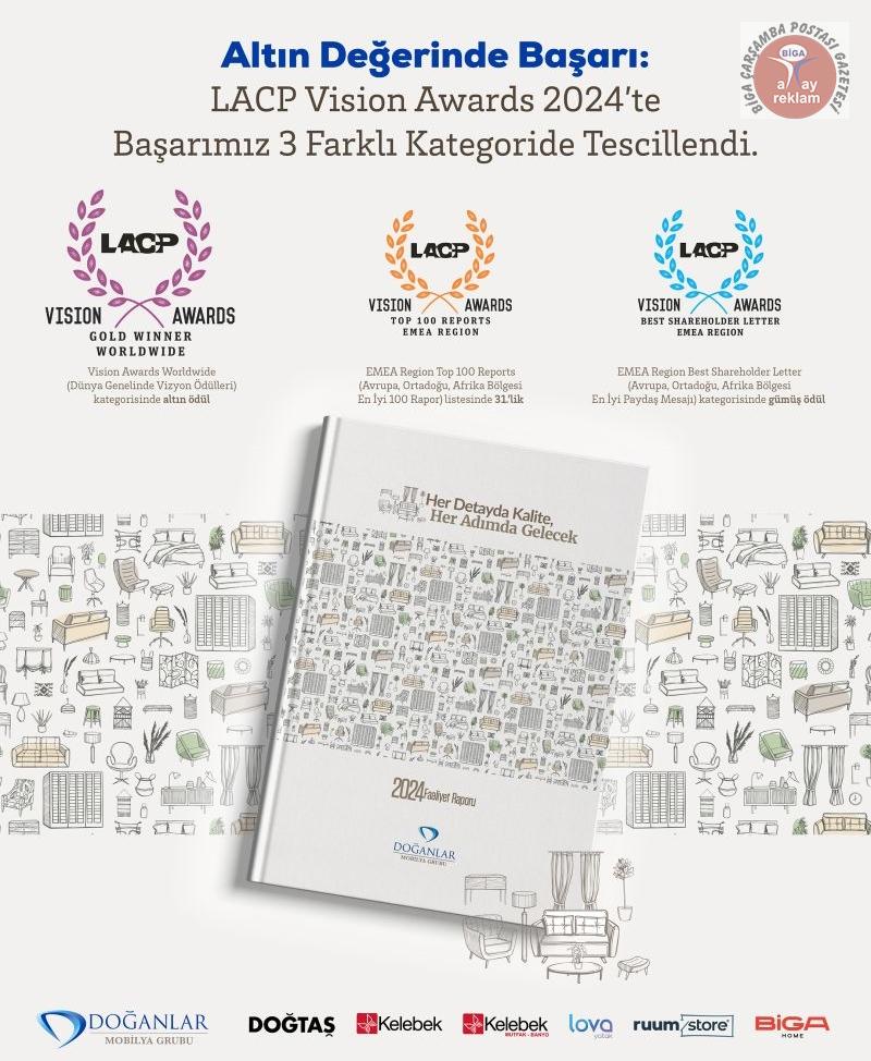 Grup şirketlerimizden Doğanlar Mobilya Grubu, uluslararası prestije sahip LACP’nin (League of American Communications Professionals) düzenlediği Vision Awards 2024’te Annual Report Competition – Retailing Segment (Yıllık Rapor Yarışması – Perakende Segmenti) kapsamında önemli bir başarı elde etti.