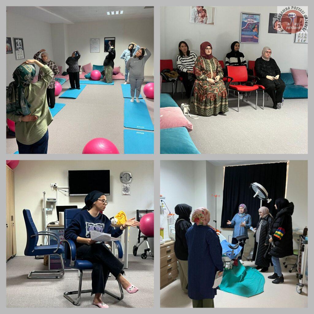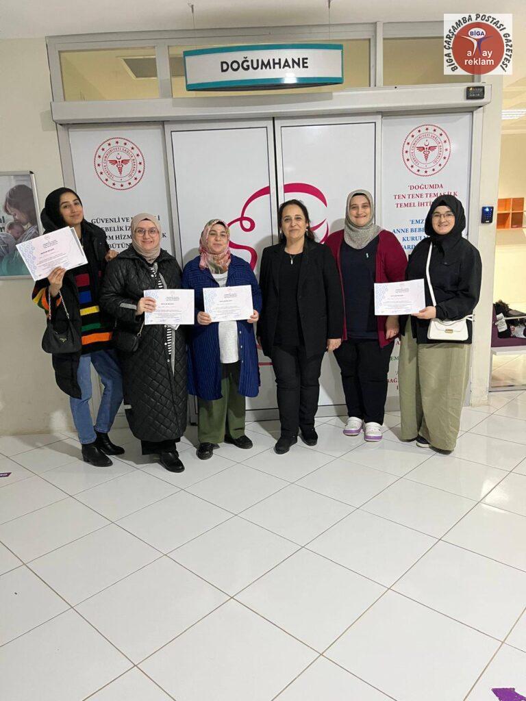 Bu bağlamda Biga Devlet Hastanesi Gebe Okuluna başvurarak ;Gebe Okulu Koordinatörü ve Emzirme Danışmanı Kadriye Başar ,Çocuk Gelişimci Tuğba Kadiroğlu, Fizyoterapist Gül Demirtaş, Diş Hekimleri Melih Ekinci ve Sultan Özkök tarafından verilen eğitimlerini tamamlayan gebelere eğitim sonunda Sağlık Bakım Hizmetleri Müdürü Deniz Özcan tarafından katılım belgeleri takdim edildi.