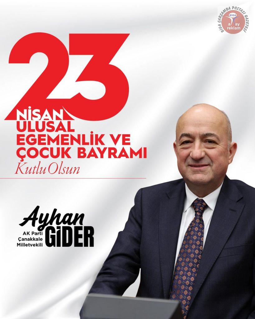AK Parti Çanakkale Milletvekili Ayhan Gider’in; Gazi Meclisimizin 106. kuruluş yıl dönümü ve 23 Nisan Ulusal Egemenlik ve Çocuk Bayramı dolayısıyla yayımladığı mesaj;