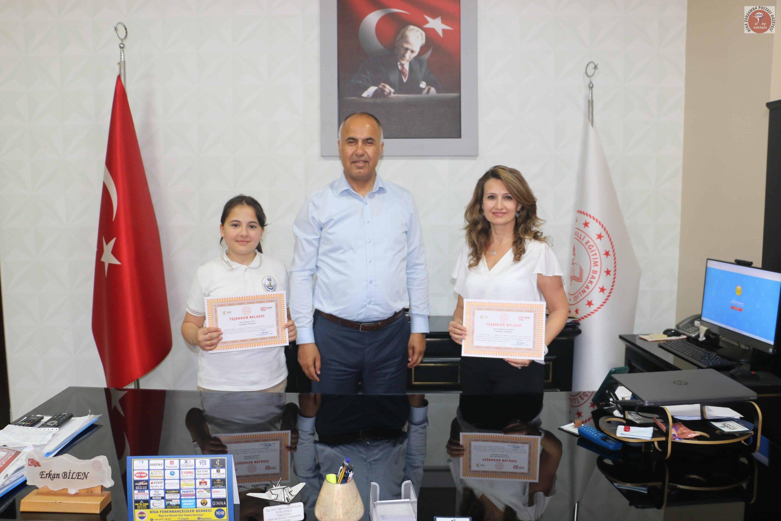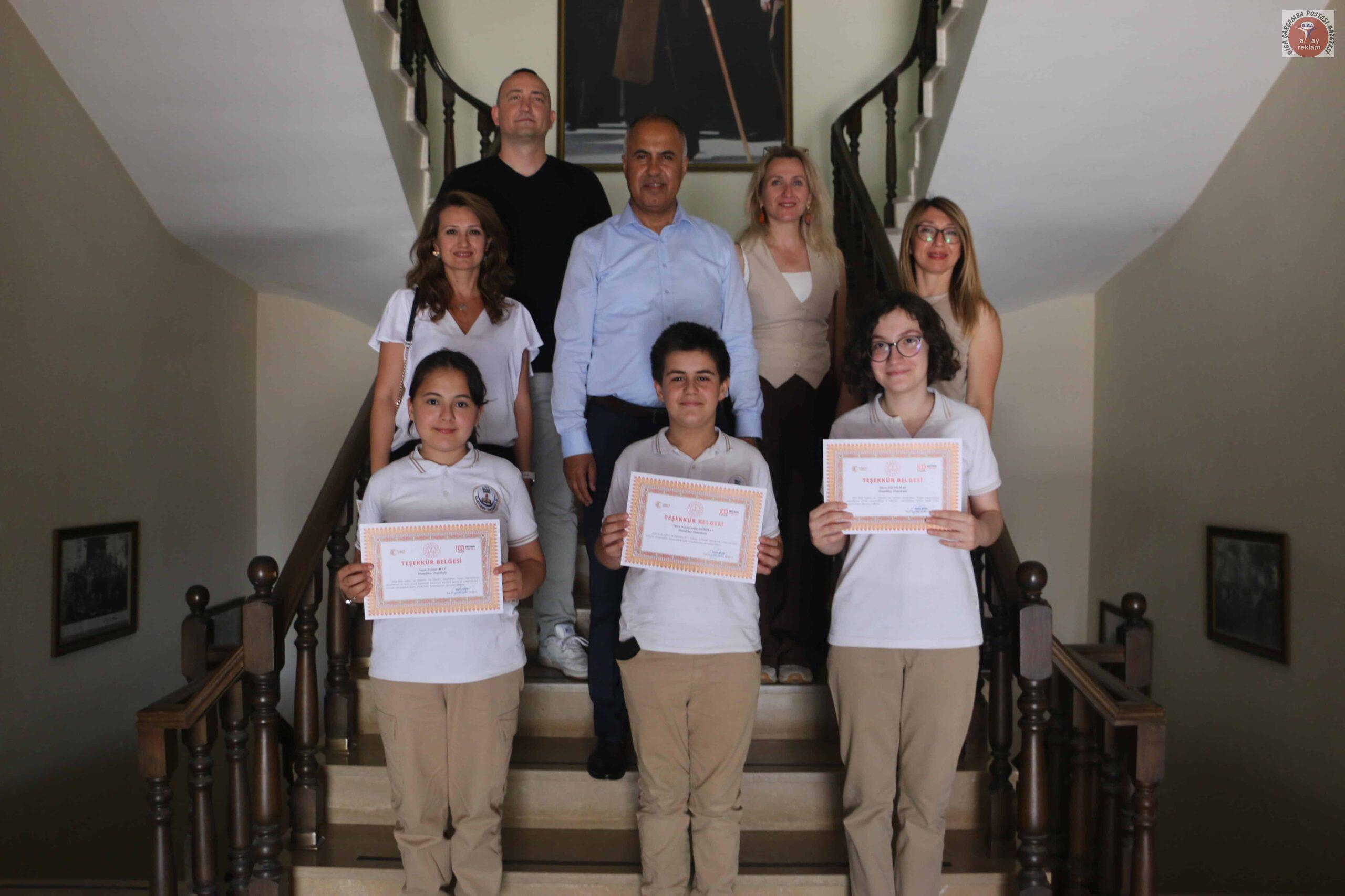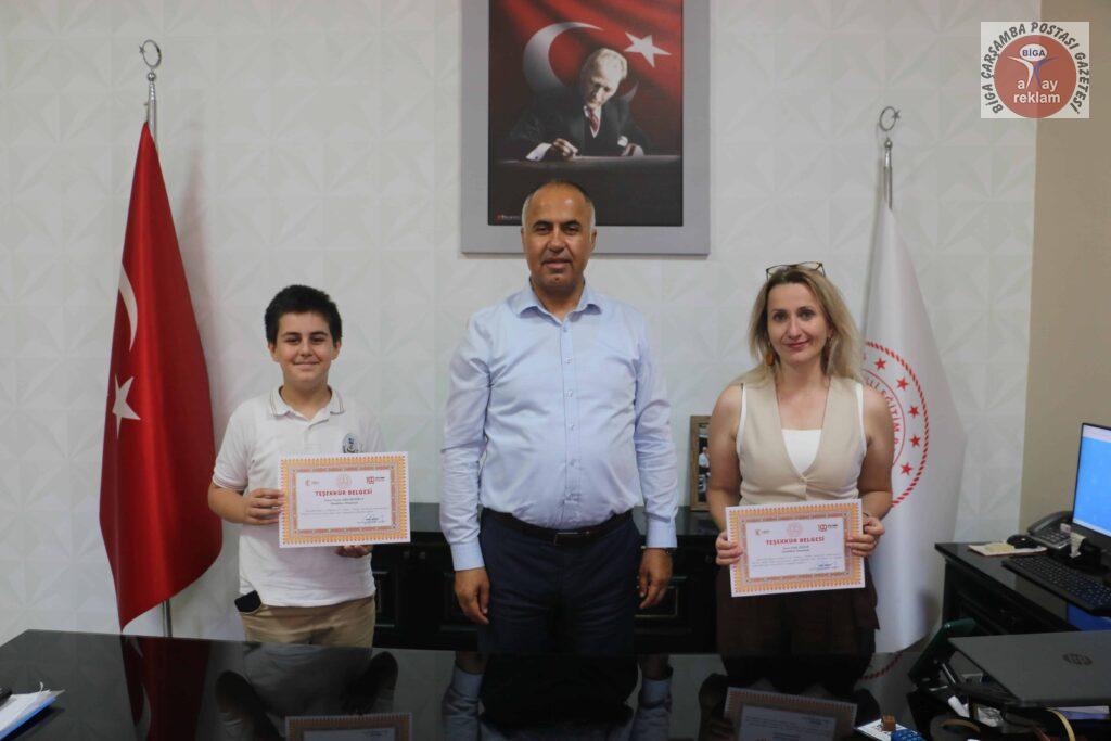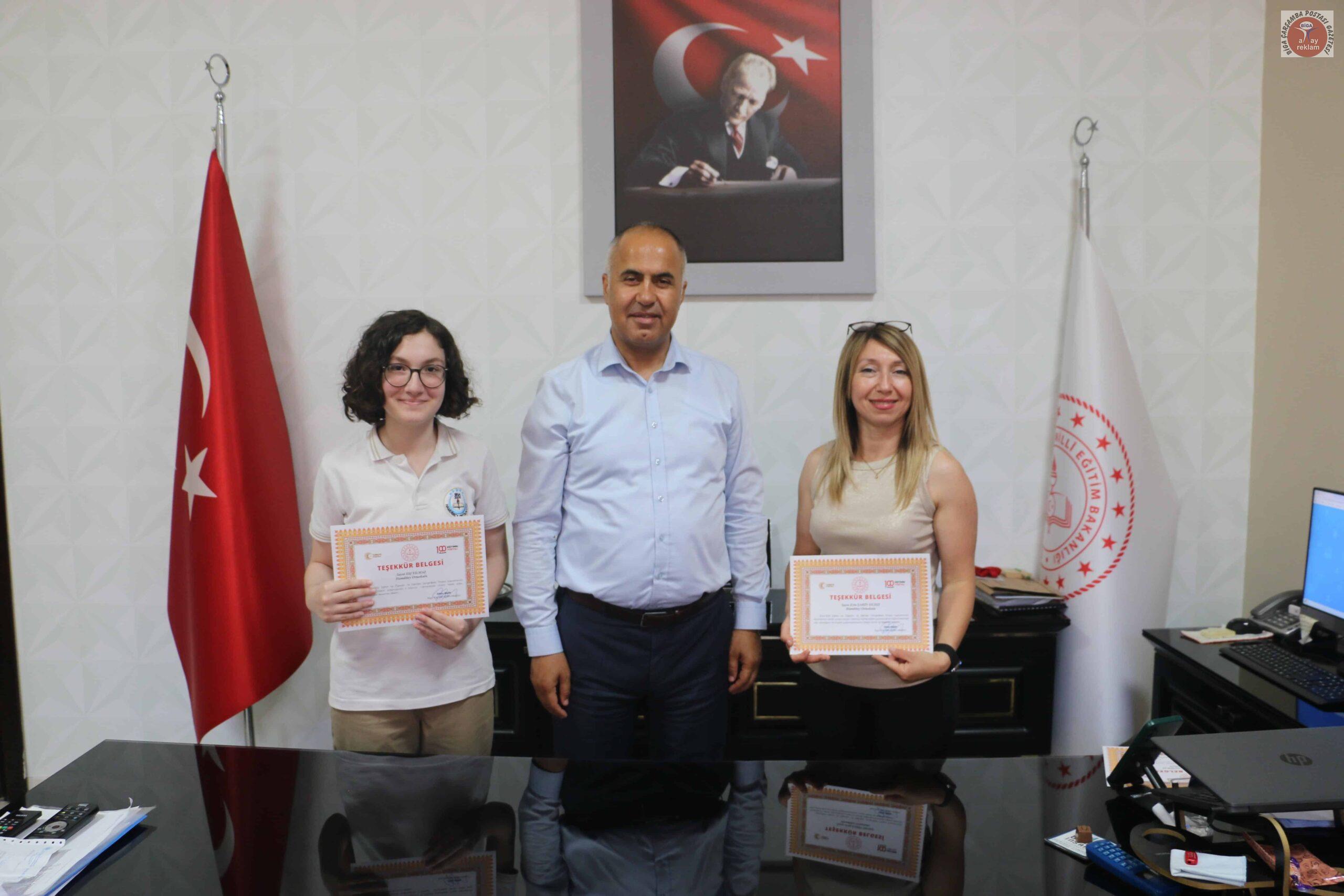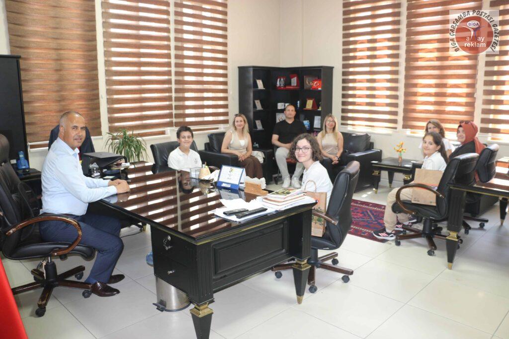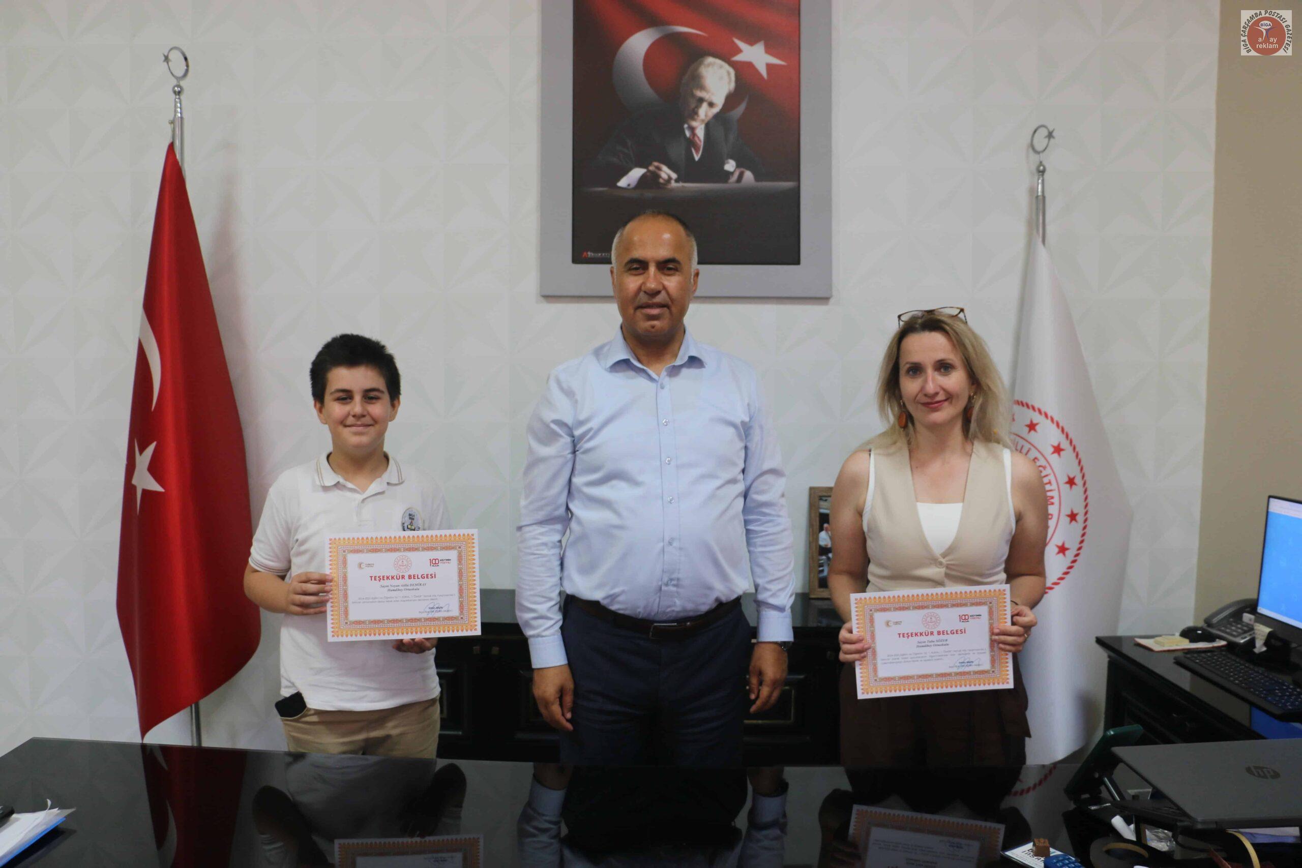 Hamdibey Ortaokulu öğrencileri beraberinde danışman öğrenmenleri ve müdür yardımcısı Latif Fidan eşliğinde Biga İlçe Milli Eğitim Müdürü Erkan Bilen’i makamında ziyaret ettiler. Müdürü Erkan Bilen, öğrencileri ve öğretmenlerini tek tek tebrik ederek, gösterdikleri başarıların diğer öğrencilere de ilham kaynağı olacağını belirtti. Bu tür projelerin hem bireysel gelişime hem de toplumsal farkındalığa katkı sunduğunu vurguladı.