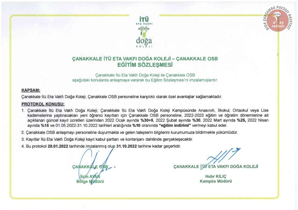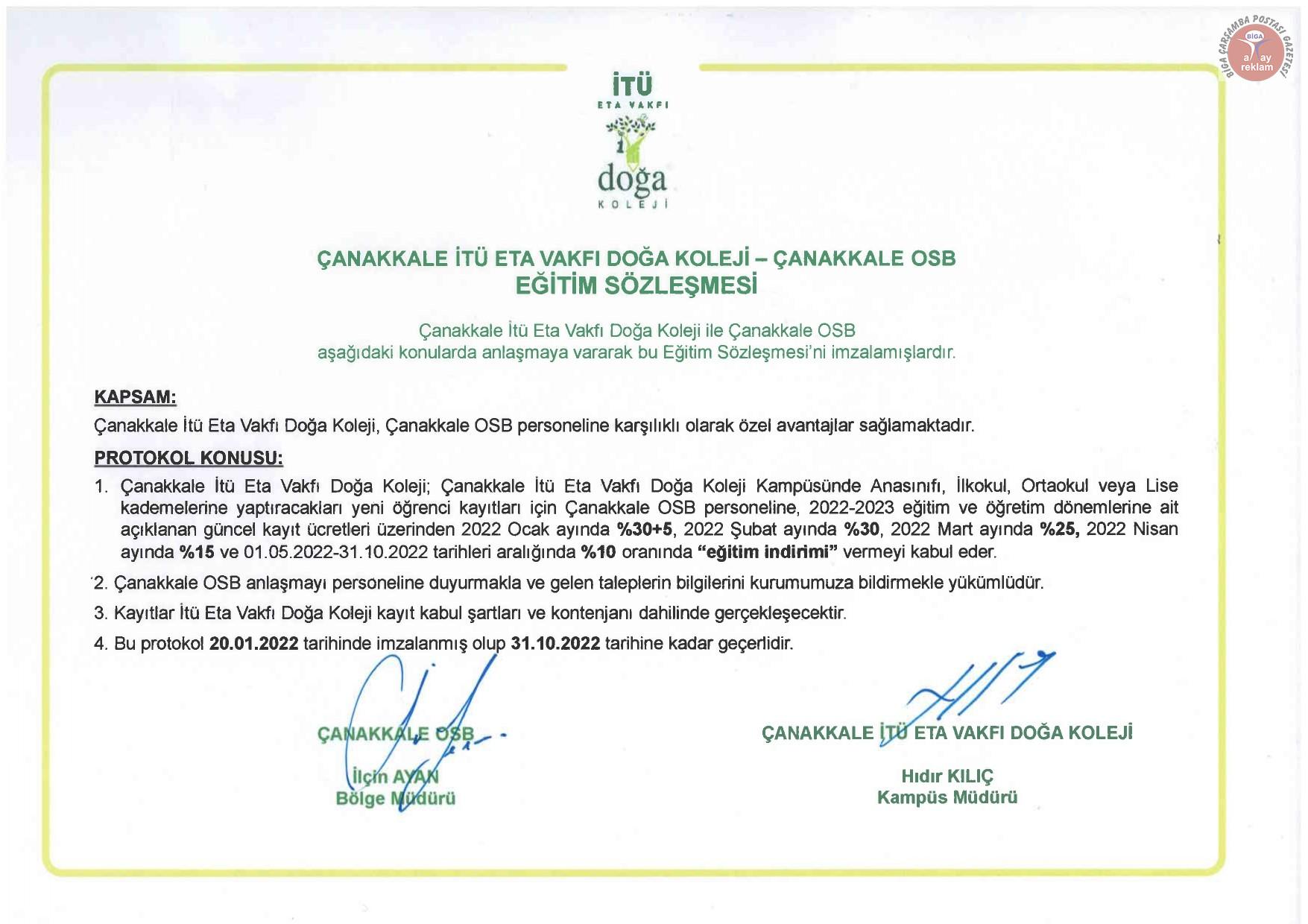 Çanakkale Organize Sanayi Bölge Müdürlüğü ve Çanakkale İTÜ ETA Vakfı Doğa Koleji arasında indirim protokolü imzalandı.