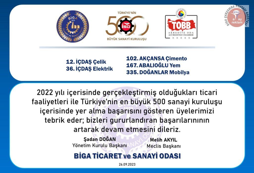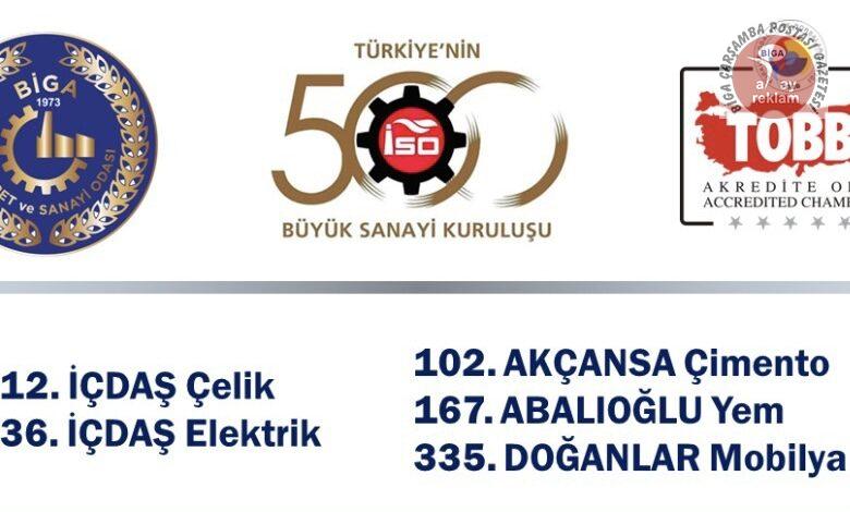 İstanbul Sanayi Odası (İSO) tarafından gerçekleştirilen ’Türkiye’nin 500 Büyük Sanayi Kuruluşu 2022 Araştırması’na göre Biga Ticaret ve Sanayi Odası (TSO) üyesi 5 firma ilk 500 arasında yer aldı.