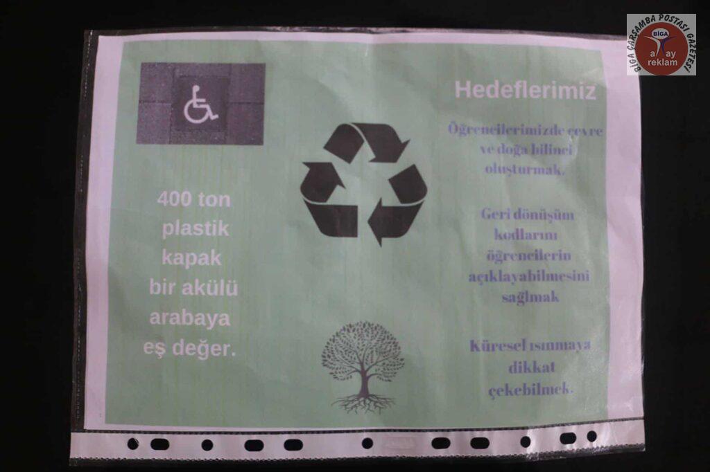 Bu proje ile hedeflerinin öğrencilerde doğa ve çevre bilinci oluşturmak, geri dönüşüm kodlarını tanıyıp okuyabilmelerini sağlamak ve küresel ısınmaya dikkat çekmek olduğunu belirttiler. 400 bin ton plastik kapak, bir akülü arabaya eş değer. Bu amaçla okulda oluşturdukları toplama alanında plastik kapaklar toplanıyor.
