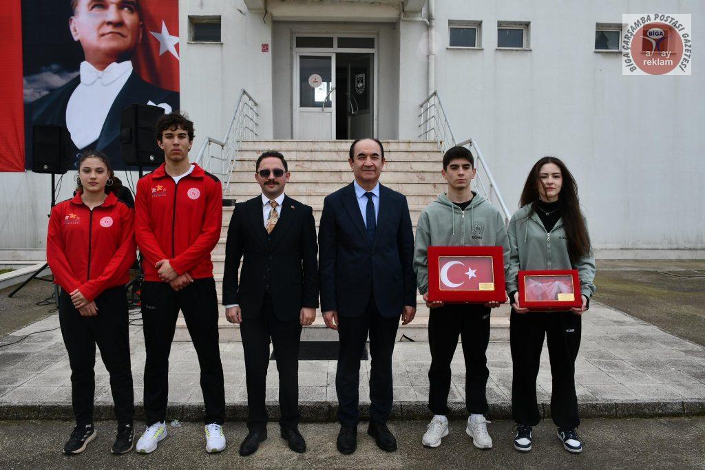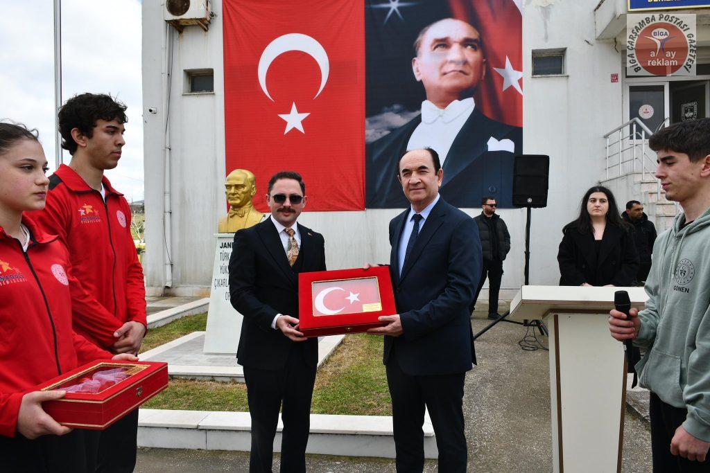 18 Mart Şehitleri Anma Günü ve Çanakkale Deniz Zaferinin 111. yılı dönümü münasebetiyle Cumhurbaşkanı Recep Tayyip Erdoğan’a takdim edilmek üzere Gelibolu Yarımadasından alınan toprak, deniz suyu ve Şanlı Bayrağımız Çanakkale İl Gençlik ve Spor Müdürlüğüne bağlı atletler tarafından Biga Kaymakamı Ercan Kayabaşı’ya teslim edildi. Kaymakam Ercan Kayabaşı, Kutsal Emanetleri teslim aldıktan sonra Gönen Kaymakamı Ahmet Altıntaş’a teslim etti.