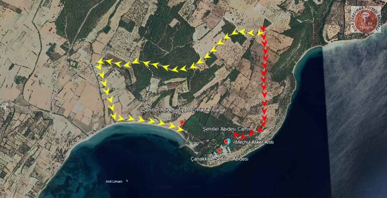 Şehitler Abidesi bölgesinde gerçekleştirilecek olan altyapı çalışmaları sebebiyle Alçıtepe istikametinden gelirken Fransız Mezarlığı kavşağından Abide B kapıya kadar olan güzergah 15 gün süreyle trafiğe kapatılacaktır. Bu süreçte Şehitler Abidesine ulaşım, Fransız Mezarlığı sapağından ayrılmak suretiyle Morto Koyu istikameti üzerinden sağlanacaktır.