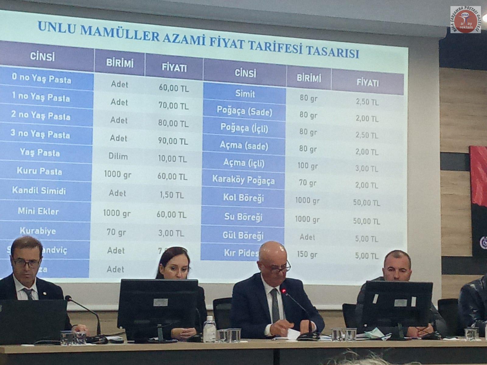 Meclis Başkanı Akyıl toplantının başında yaptığı açıklamada Gıda Maddeleri İmalatı (ekmek, unlu mamüller ve şerbetli tatlılar) ile iştigal eden Oda üyelerinden yeni azami fiyat tarifesi verilmesi konusunda gelen talepler olduğunu belirtti.
