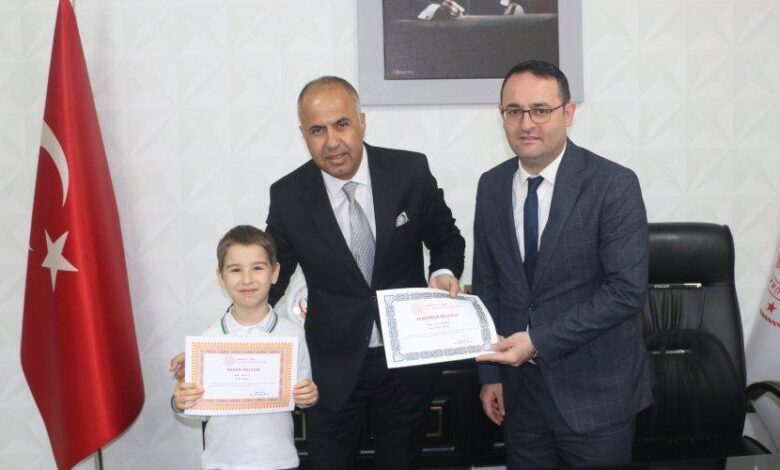 Biga İlçe Milli Eğitim Müdürü Erkan Bilen kendisini ziyaret eden Sakarya İlkokulu Müdürü Mustafa Berber ve öğrencisini tebrik ederek başarı belgesi takdim etti, Türkiye Finallerinde başarılar diledi.
