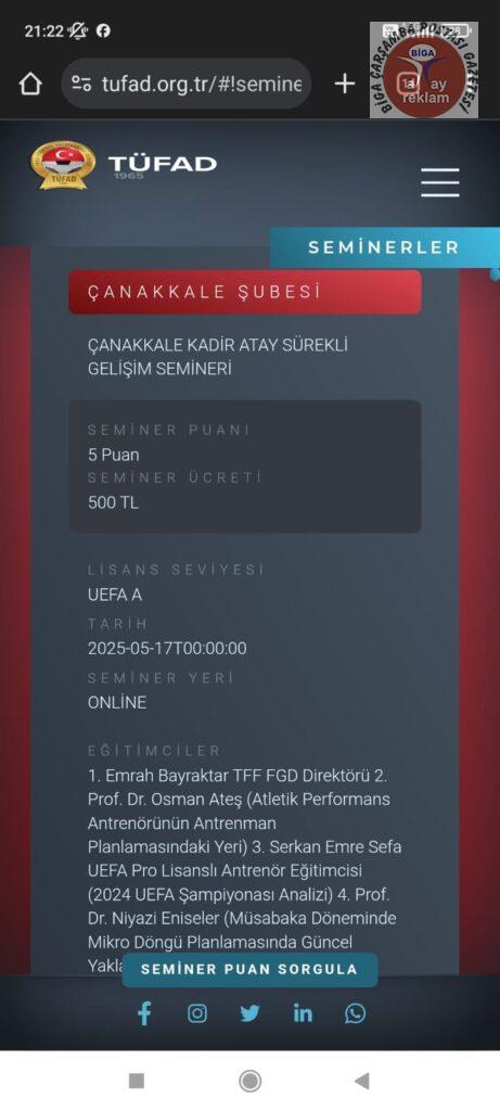 Türkiye Futbol Federasyonu tarafından da onaylanan “Çanakkale Kadir Atay Sürekli Gelişim Semineri” 17-18-19 Mayıs 2025 tarihlerinde online olarak gerçekleşecek.