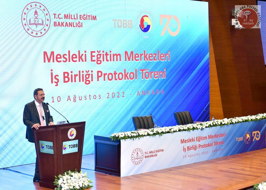 Hisarcıklıoğlu, törende yaptığı konuşmada, memleketin öncelikli meselesinin eğitim olduğuna inandıklarını söyledi. TOBB’un eğitim alanında yaptıklarına değinen Hisarcıklıoğlu, “Özel sektör olarak, nitelikli çalışan bulamamaktan, mesleki eğitimin ihtiyaçları karşılamamasından şikayet ediyorduk. Mesleki eğitimde kamu-özel sektör iş birliğini artırmak, özel sektörün rolünü güçlendirmek istiyorduk. Mesleki eğitim, özel sektörün insan kaynağını karşılamada en önemli vasıta olsun istiyorduk. Bu bizim 20 senedir gündemimizde olan bir konuydu. Bakanımız Sayın Mahmut Özer’den bu konuda hem büyük destek hem de önemli icraatlar gördük.” diye konuştu. Hisarcıklıoğlu, mesleki eğitimin, eğitim dünyasında yeniden cazibe merkezi haline geldiğine işaret ederek, Türkiye genelindeki meslek liselerdeki doluluk oranının 2022 LGS’de yüzde 95 olduğunu söyledi.